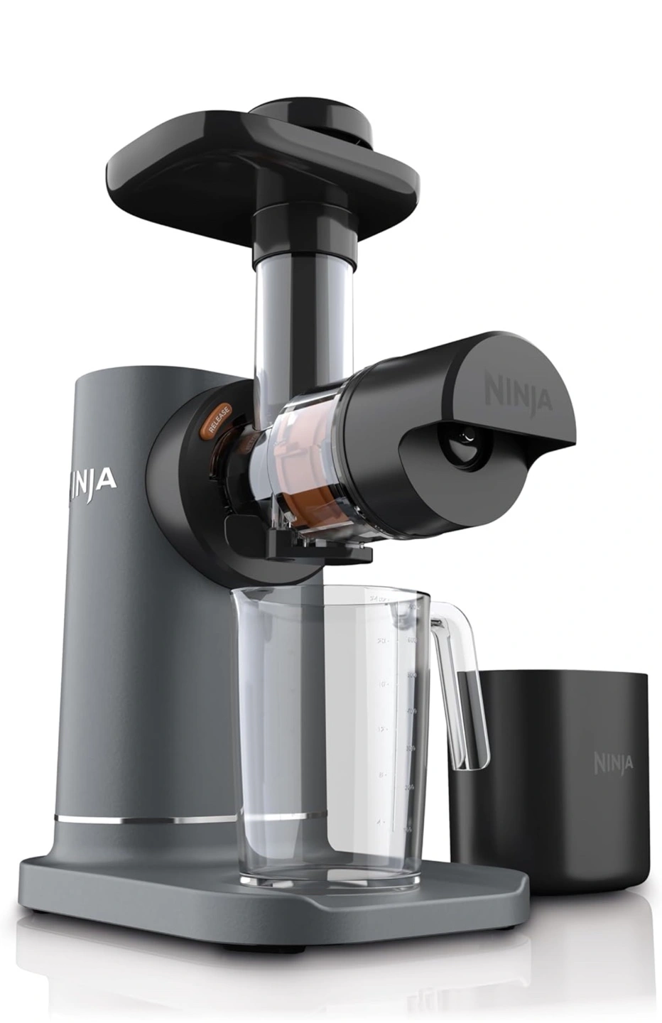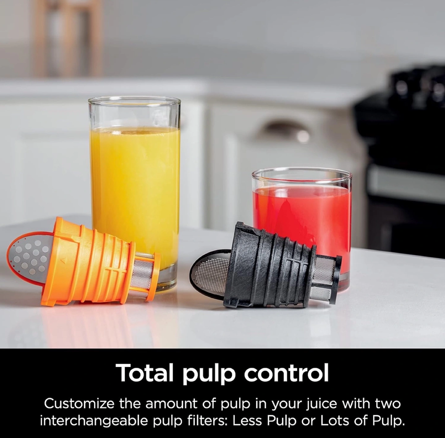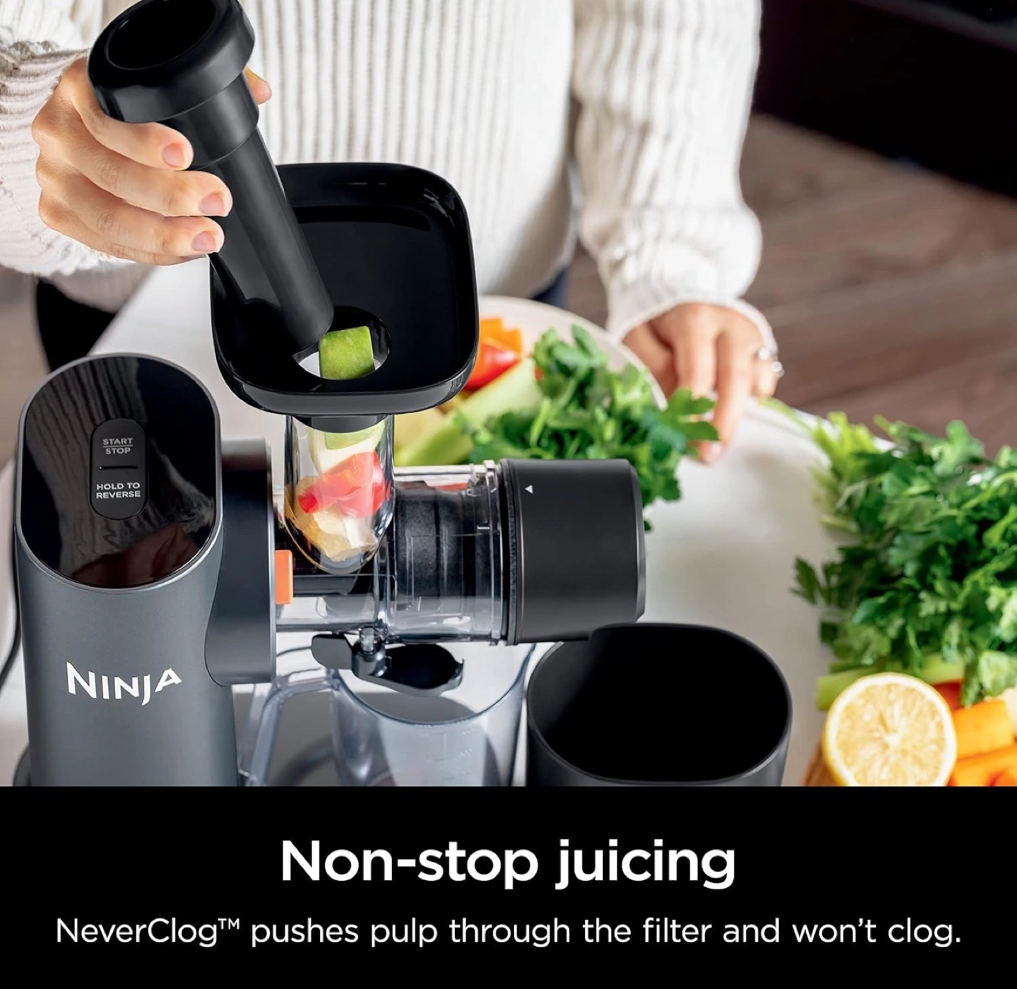35Ninja brand cold press juicer. Powerful auger. Two interchangeable pulp filters. NeverClog technology. Makes juice with less or lots of pulp. Includes pulp container and measuring cup.