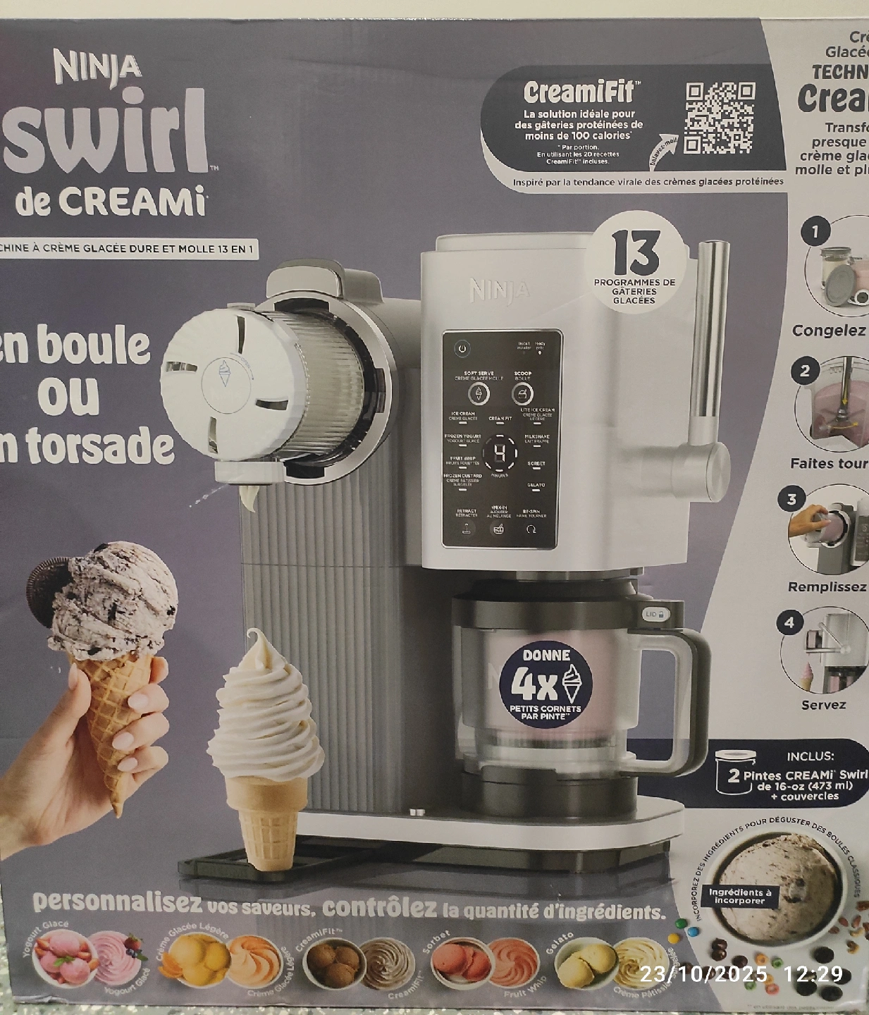12Get ready to make delicious frozen treats at home with the Ninja Swirl Creami! This 13-in-1 soft serve and ice cream machine lets you customize your flavours and control your ingredients. It's perfect for creating protein-packed treats and inspired by the viral protein ice cream trend. Makes 4 small cones per pint. Includes 2 Creami Swirl 16-oz pints + lids