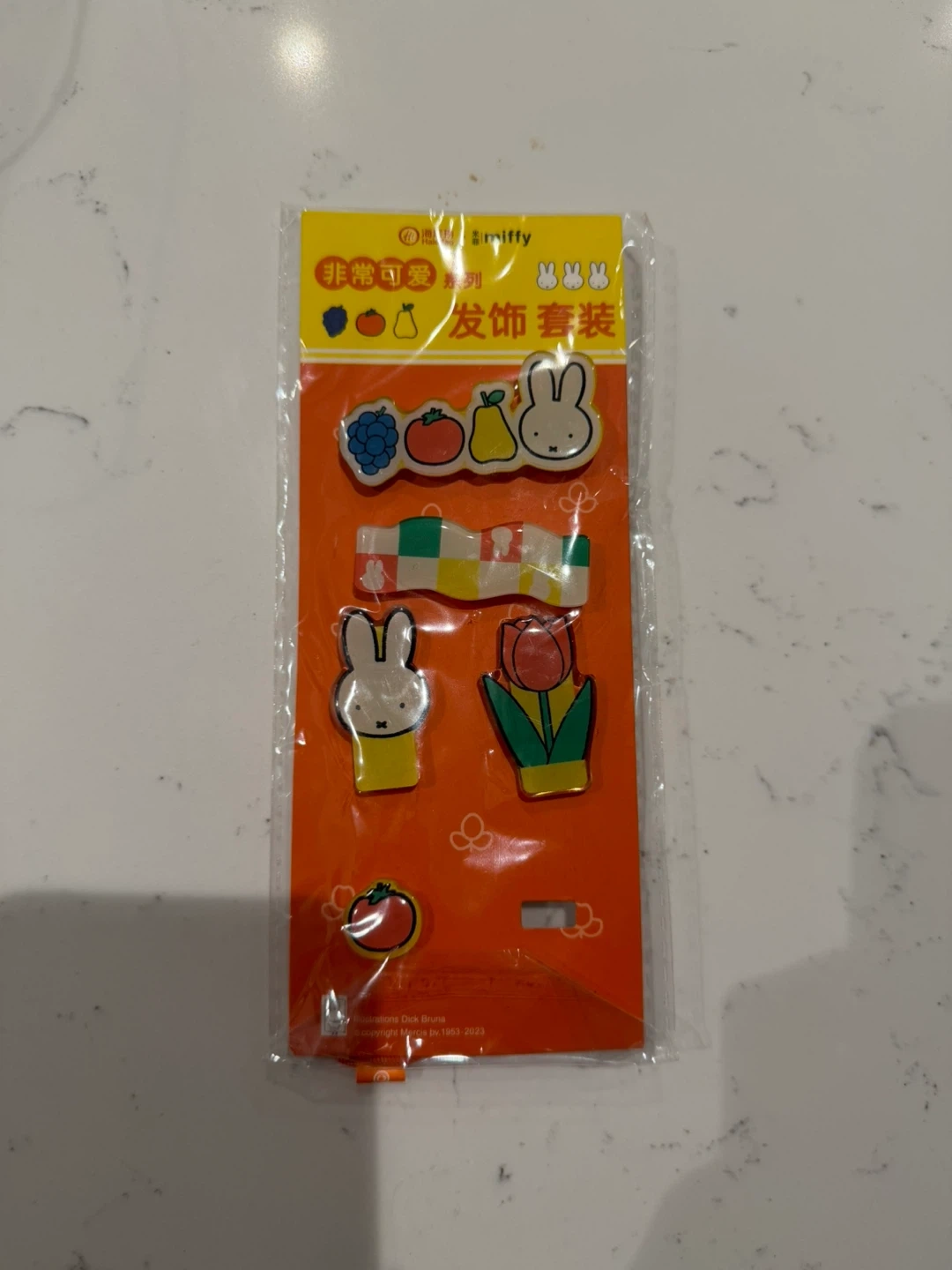 This Miffy hair accessory set includes adorable Miffy bunny and tulip hair clips, along with a matching scrunchie and hair ties. It's perfect for adding a cute touch to any hairstyle!