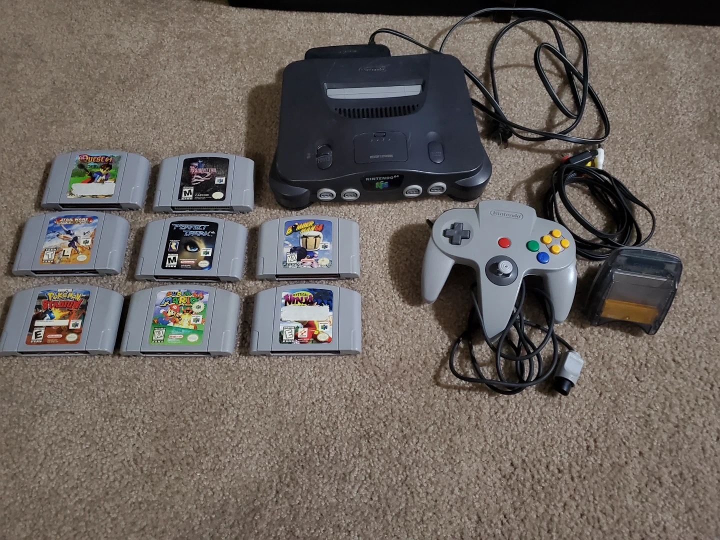 60Selling a Nintendo 64 console with a controller and expansion pak. Also includes eight games: Quest 64, Resident Evil 2, Star Wars Rogue Squadron, Perfect Dark, Bomberman 64, Pokemon Stadium, Super Mario 64, and Mystical Ninja If you have any questions please let me know. I can also meet you downtown.