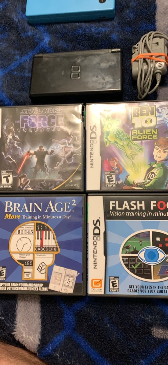 Selling a collection of Nintendo DS games and a console. Games include Star Wars: The Force Unleashed, Ben 10 Alien Force, Brain Age 2, and Flash Focus. Perfect for some retro gaming fun!