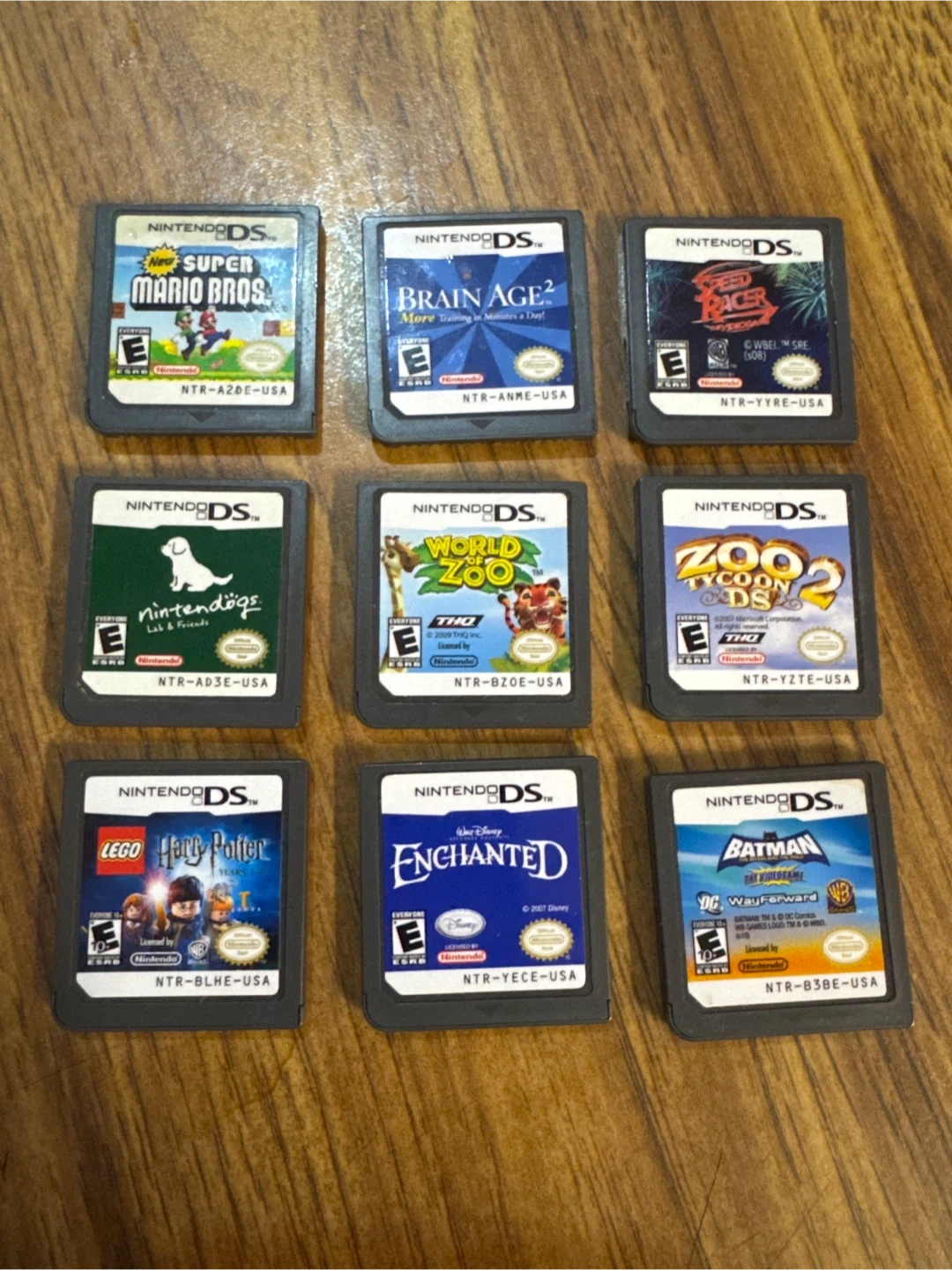 74Selling a collection of Nintendo DS games! Includes: - New Super Mario Bros - Brain Age 2 - Speed Racer - Nintendogs - World of Zoo - Zoo Tycoon 2 - LEGO Harry Potter - Enchanted - Batman: The Videogame I don’t have case for any of these games, just game cards. I am selling all at once.