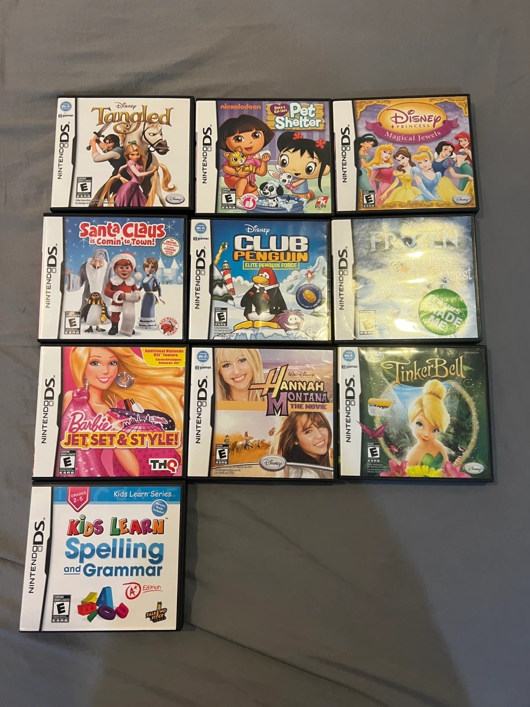 Selling a collection of Nintendo DS games! Titles include: - Tangled - Dora the Explorer Pet Shelter - Disney Princess Magical Jewels - Santa Claus is Comin' to Town! - Club Penguin Elite Penguin Force - Frozen - Barbie Jet, Set & Style! - Hannah Montana The Movie - Tinkerbell - Kids Learn Spelling and Grammar All games are in good condition and ready for some fun!