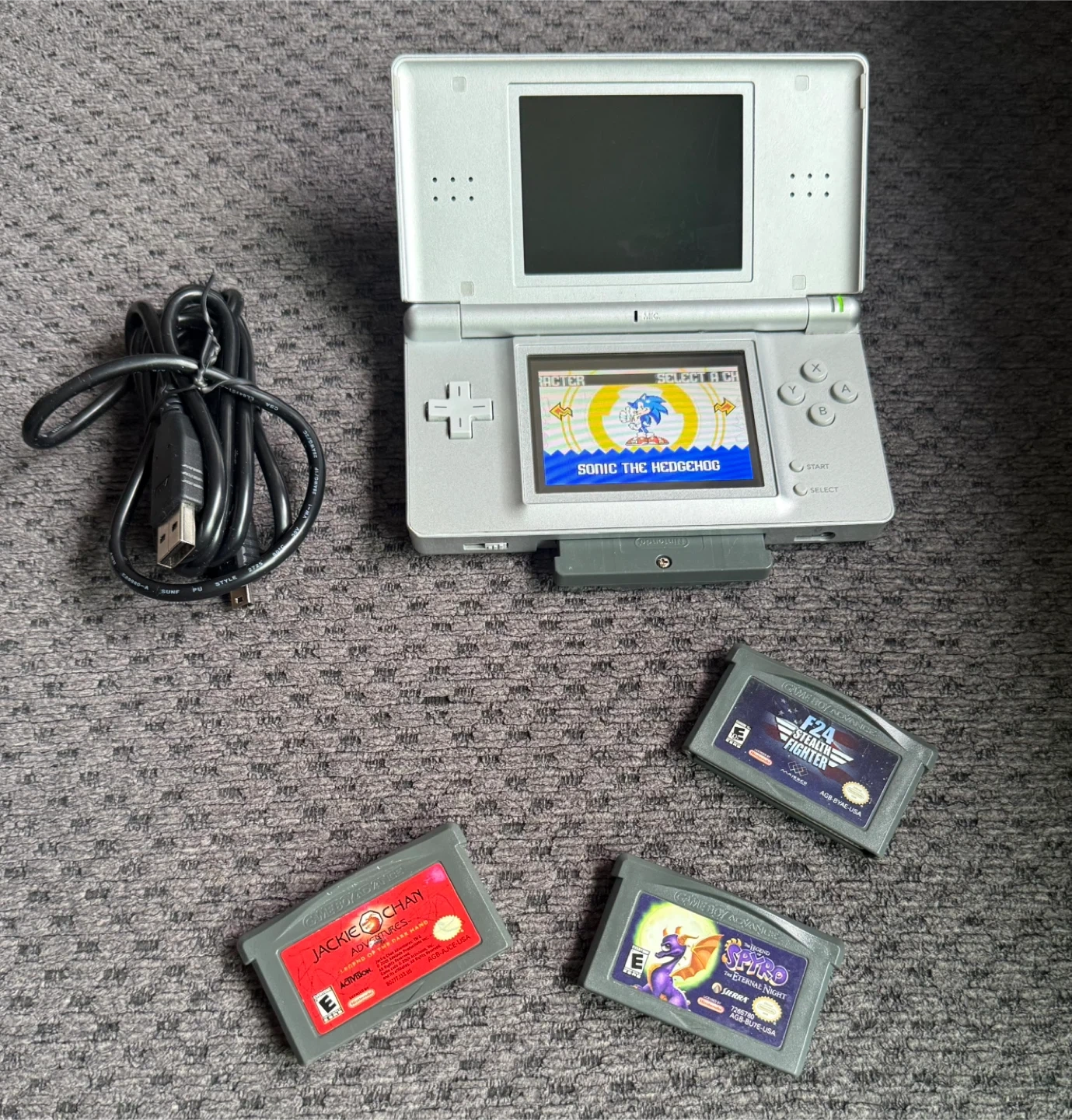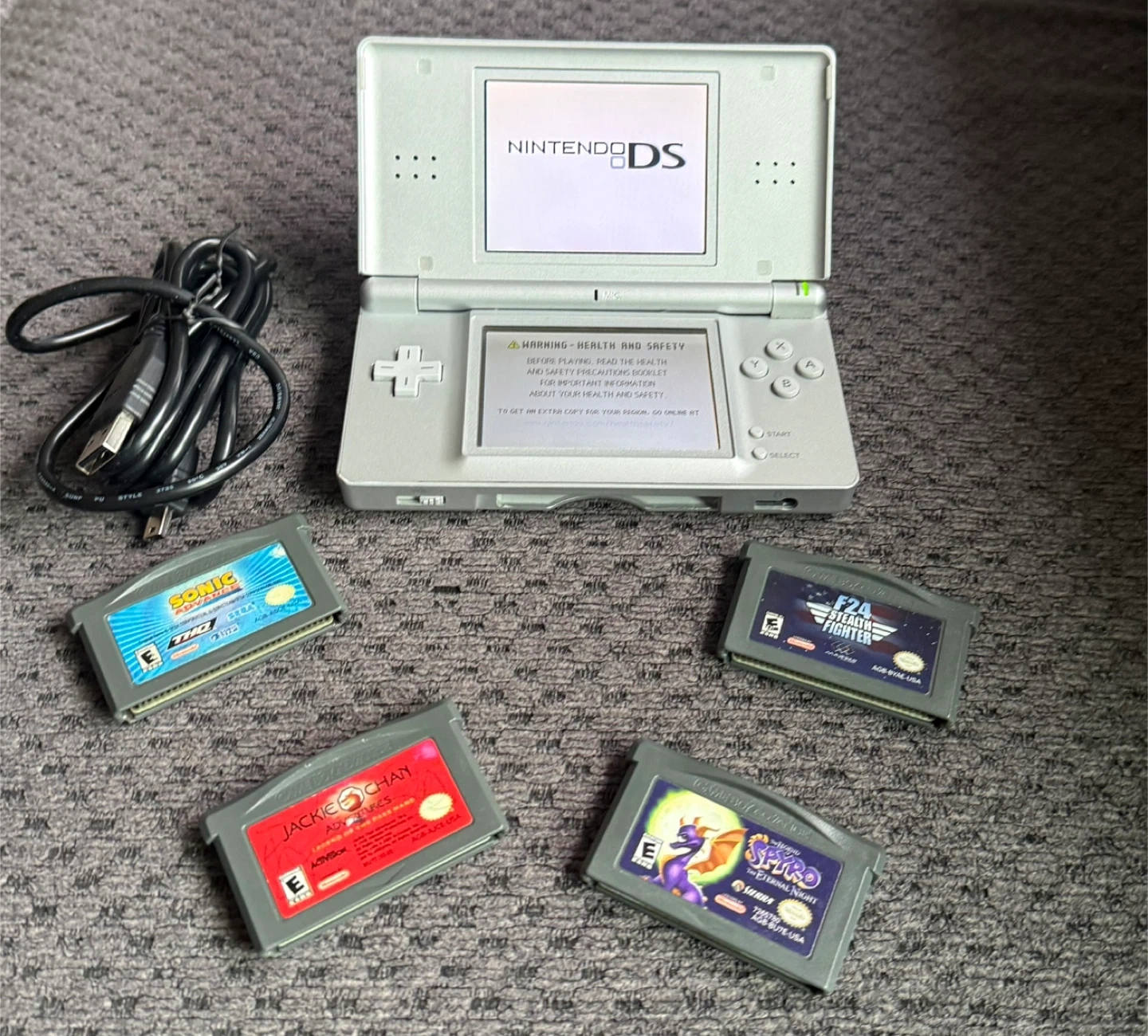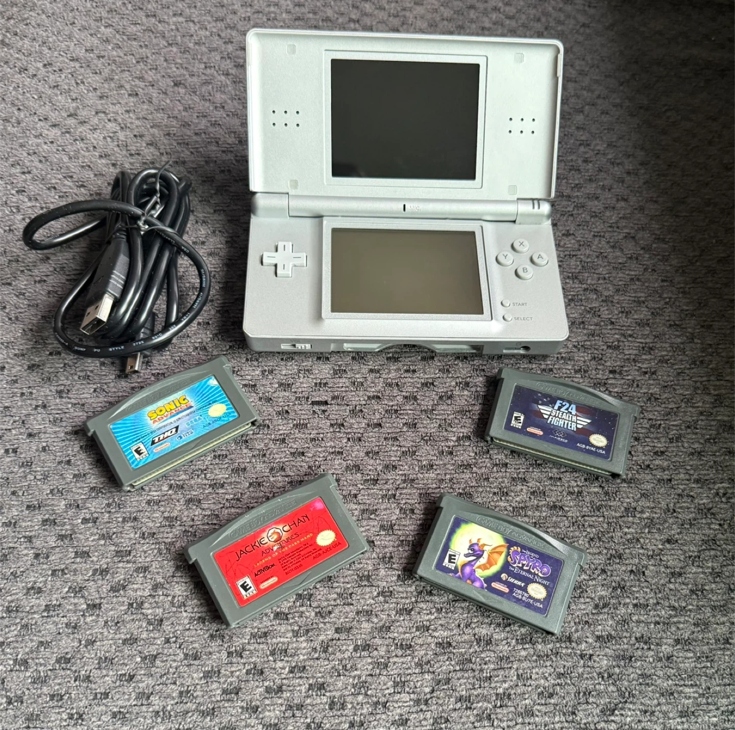 23Selling a Nintendo DS lot including two consoles and four games! You'll get one silver Nintendo DS and one red Nintendo DS. Also included are four Game Boy Advance games: Sonic Advance 2, F-24 Stealth Fighter, Jackie Chan Adventures, and Spyro: Season of Ice. Both consoles come with their chargers and styluses