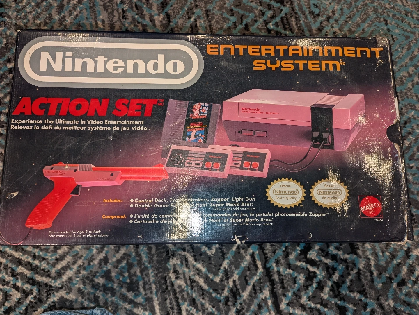 60Selling a Nintendo Entertainment System Action Set! It includes the control deck, two controllers, and the Zapper light gun.
