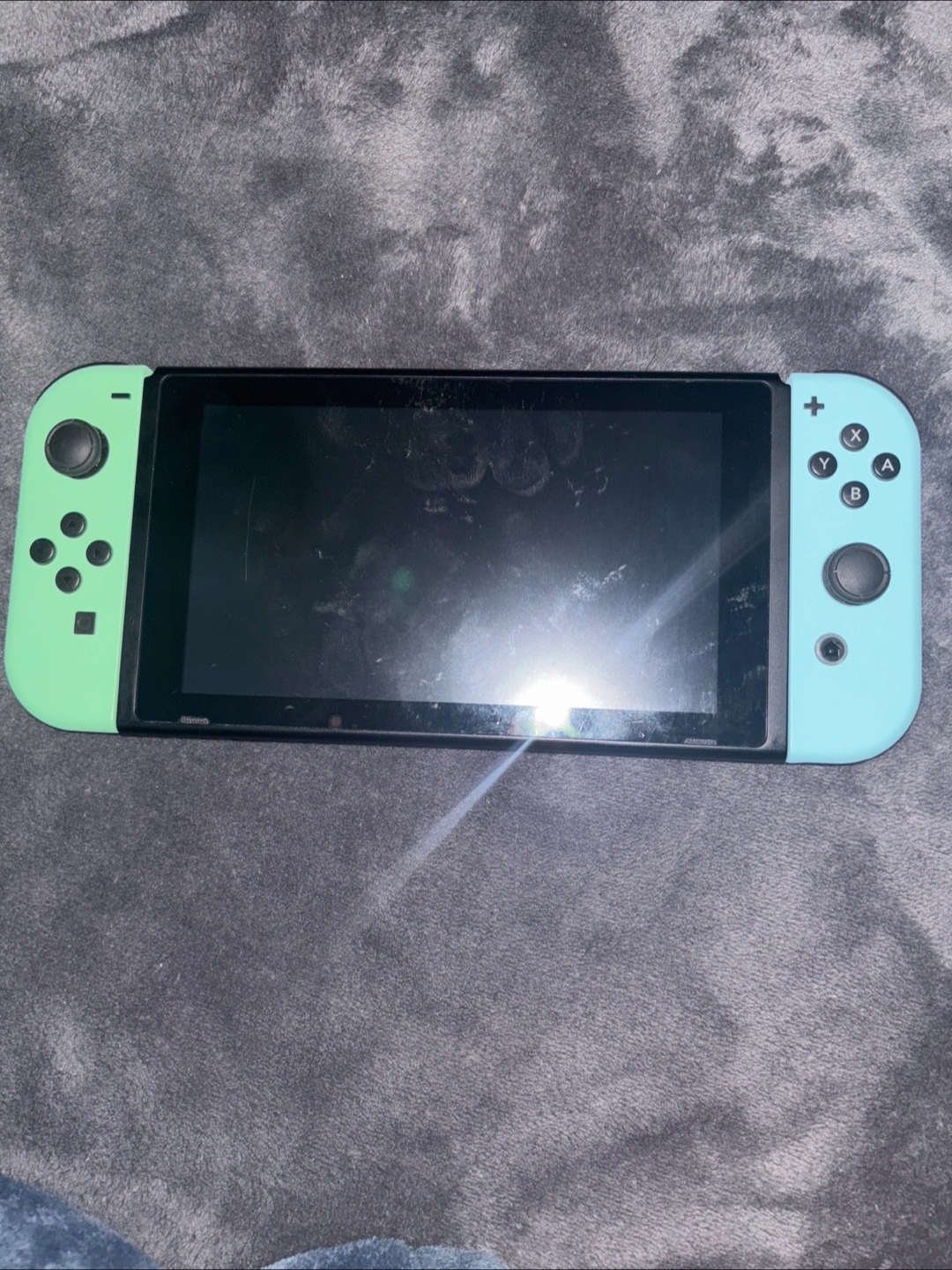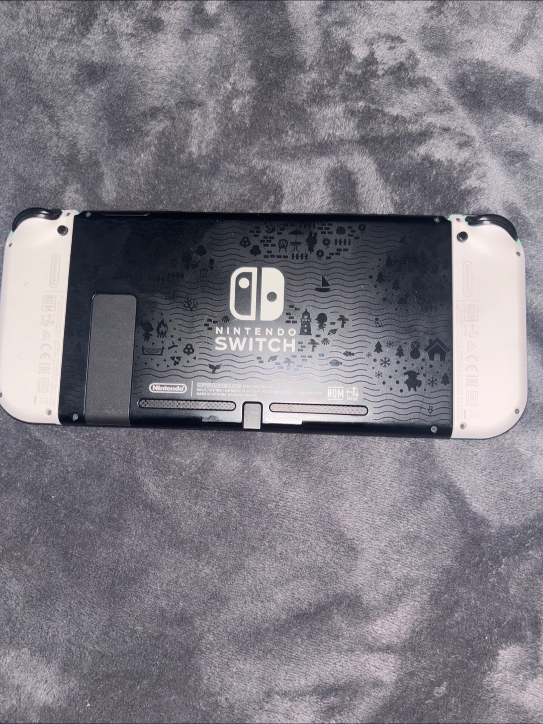 Nintendo Switch – Animal Crossing Edition (Console + Joy-Cons Only) Selling a working Animal Crossing Edition Nintendo Switch. Comes with pastel green and blue Joy-Cons and the special edition console backplate. No charger or dock included — just what’s shown in the pictures. Condition: Used, works great. Screen has some smudges but no cracks.