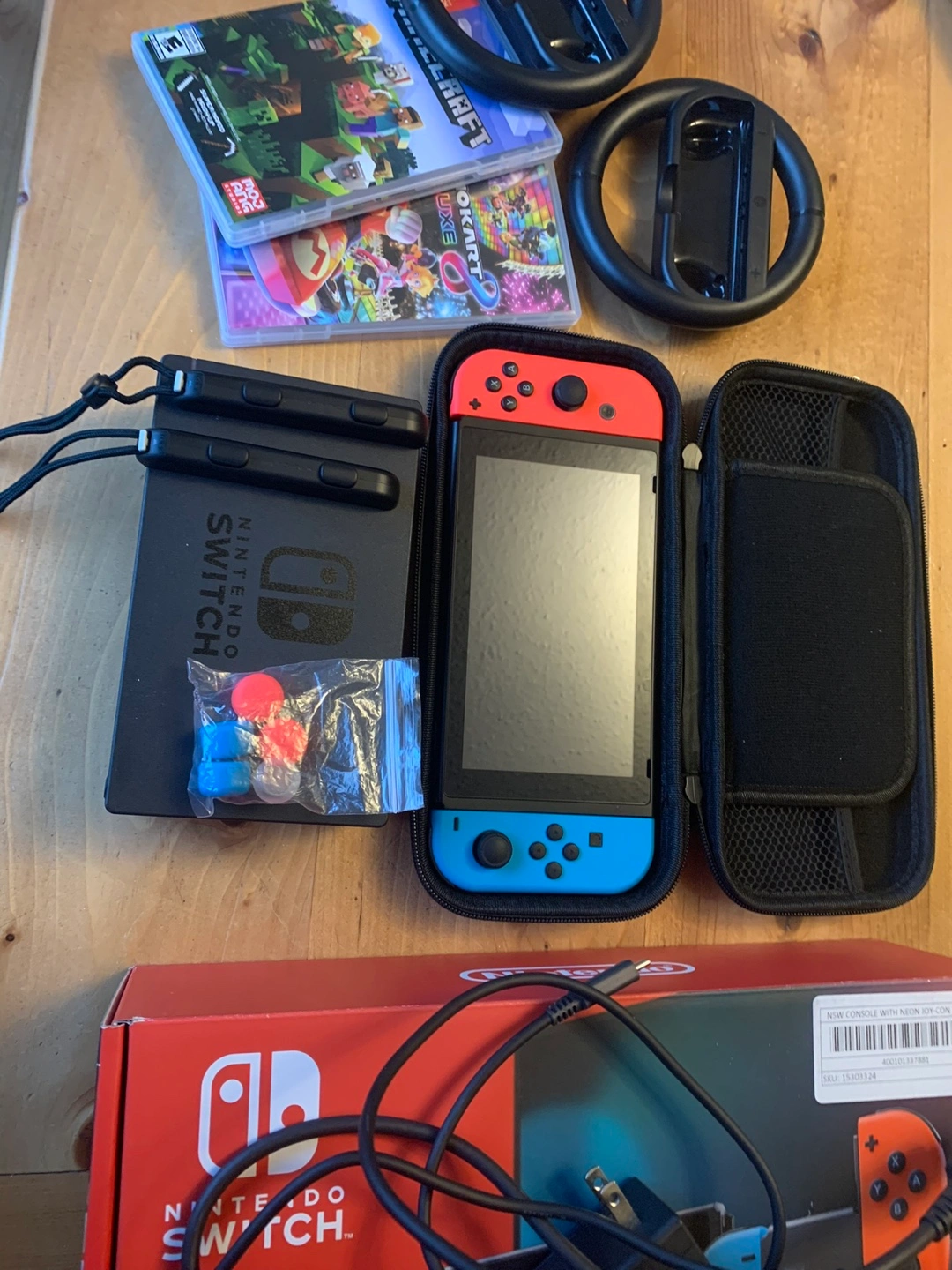 10Nintendo switch bundle Dm for more info/pics Includes following Nintendo and all included in box Nintendo travelling case Steering wheel Nintendo clear covering Button covers Mario cart 8 deluxe Minecraft Bundle only Time wasters will be ignored. Dm for more info/pics Valued over 600 Smoke free home Pickup transconna only No trades