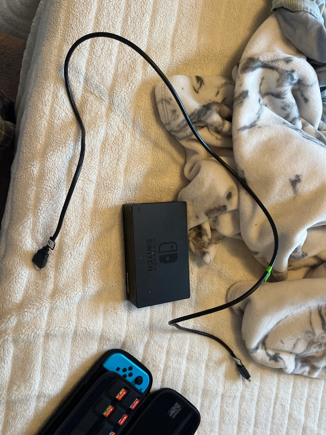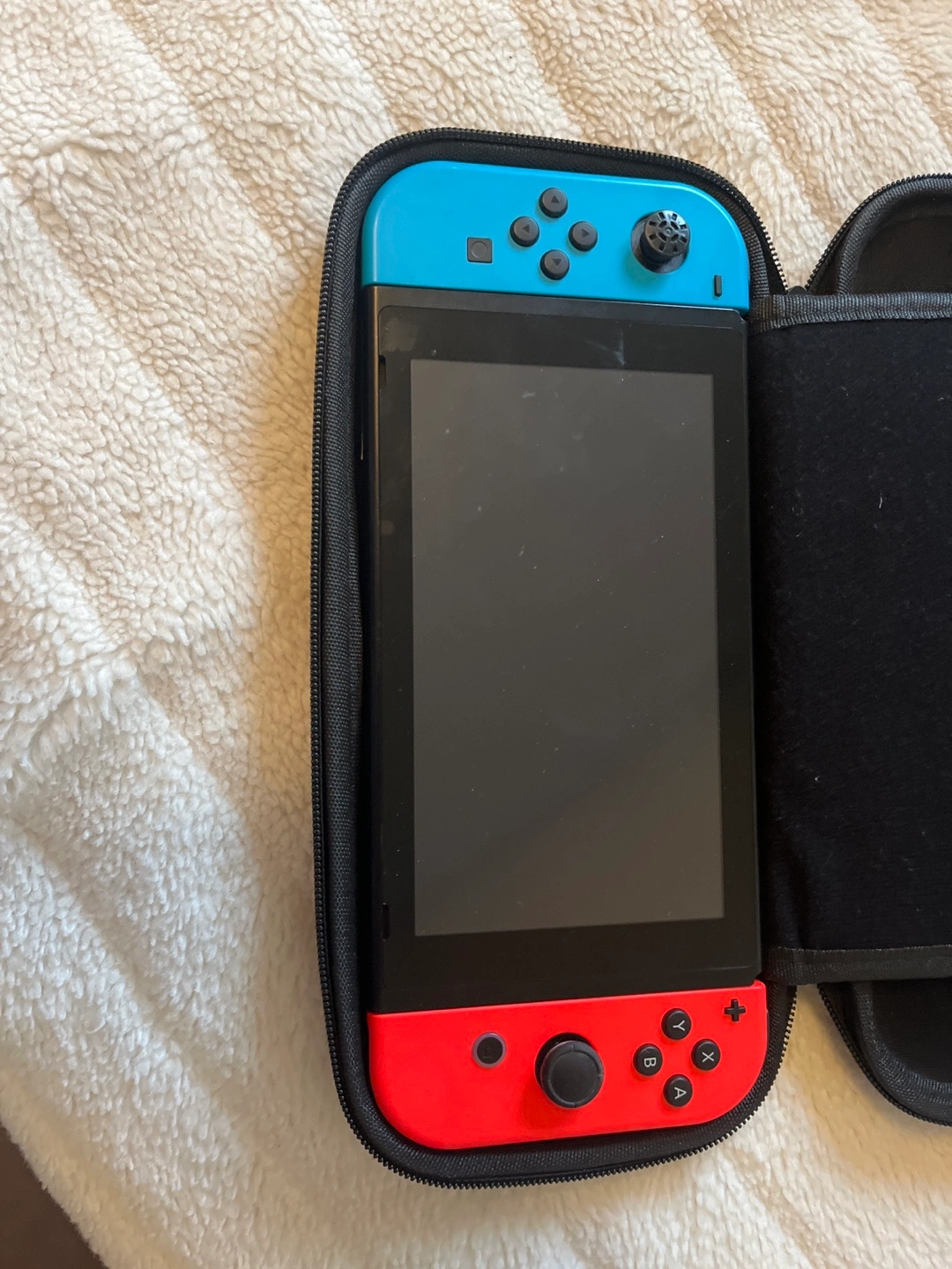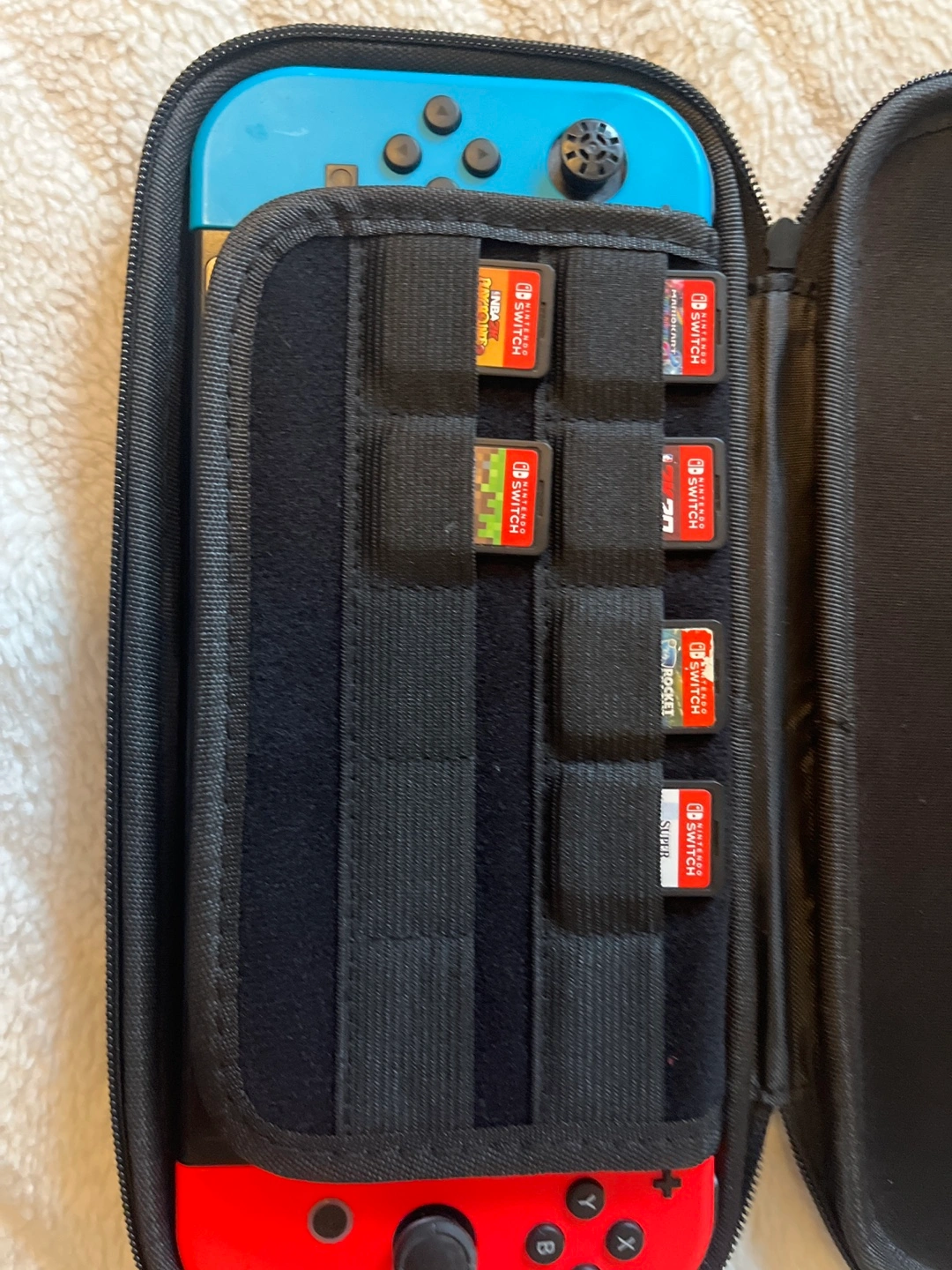 5Nintendo Switch console, red and blue joy-cons. Includes carrying case, several game cartridges, and extra accessories. Charging cable and two pairs of joy-con grips also included.