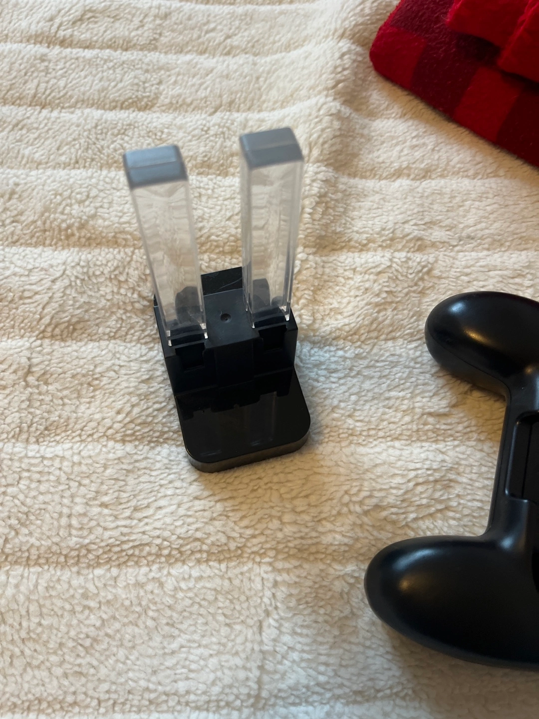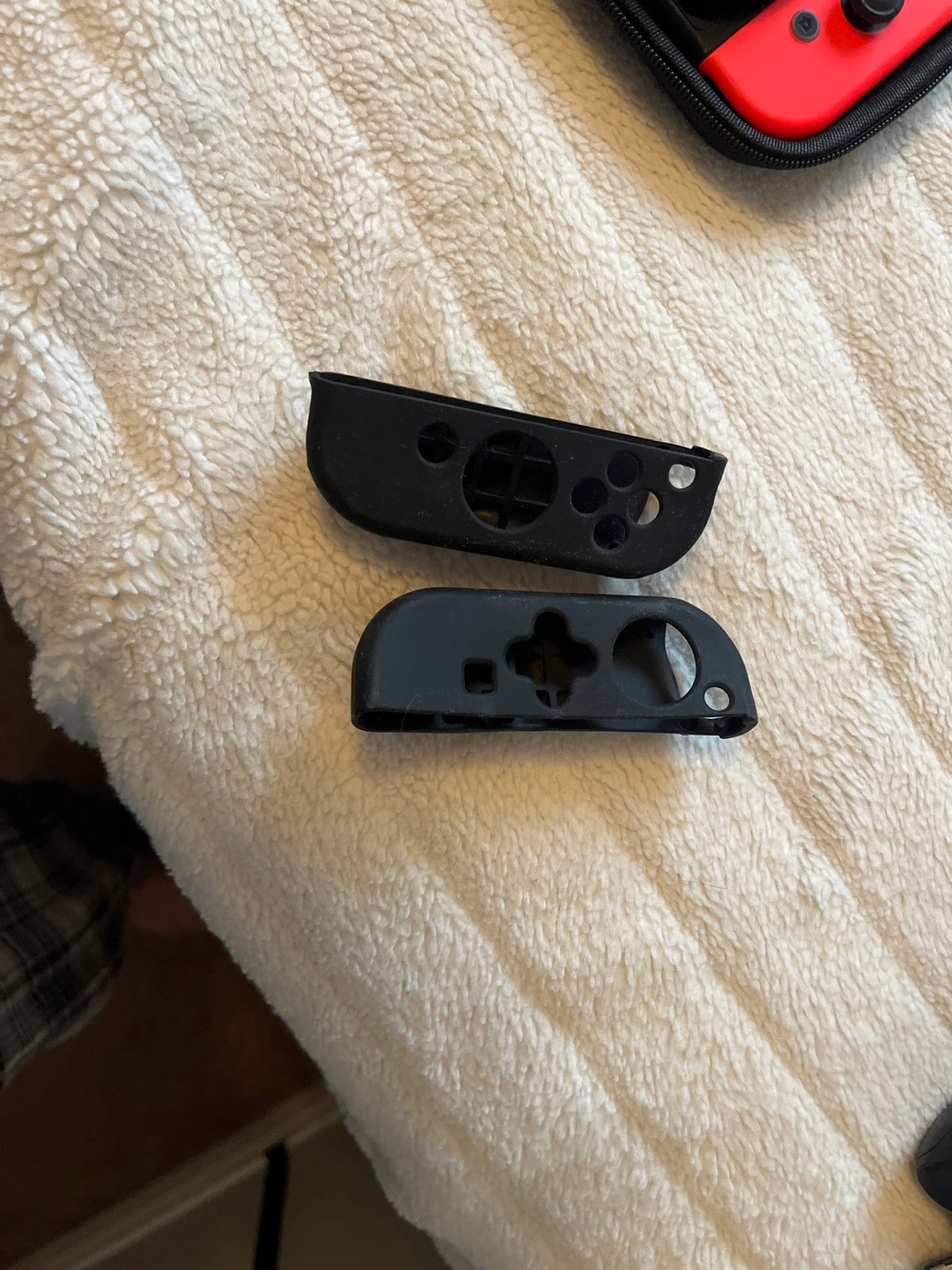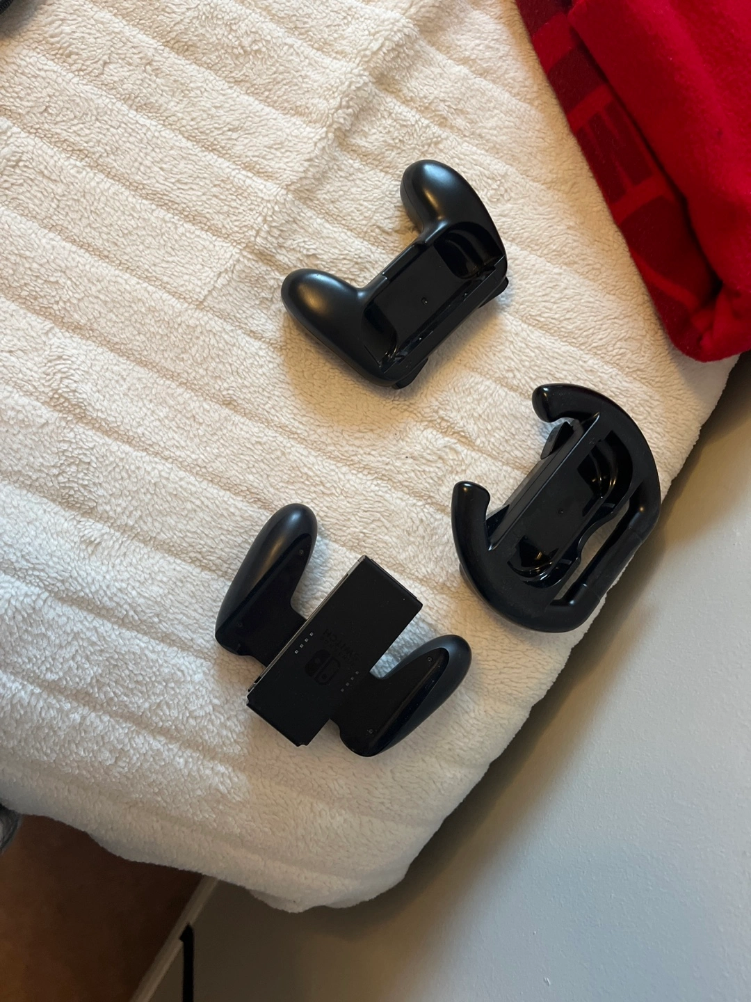 5Nintendo Switch console, red and blue joy-cons. Includes carrying case, several game cartridges, and extra accessories. Charging cable and two pairs of joy-con grips also included.