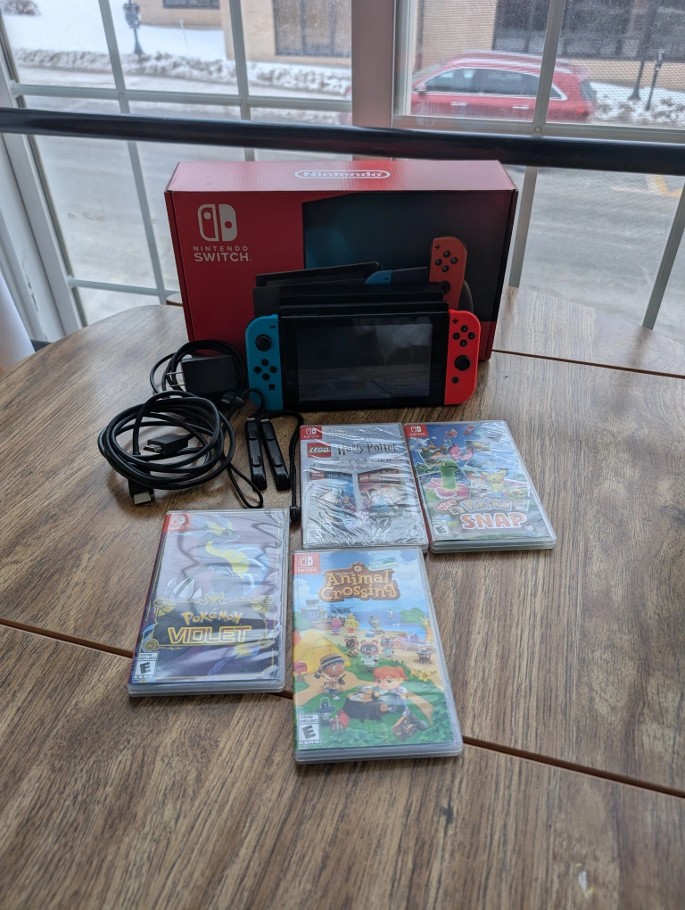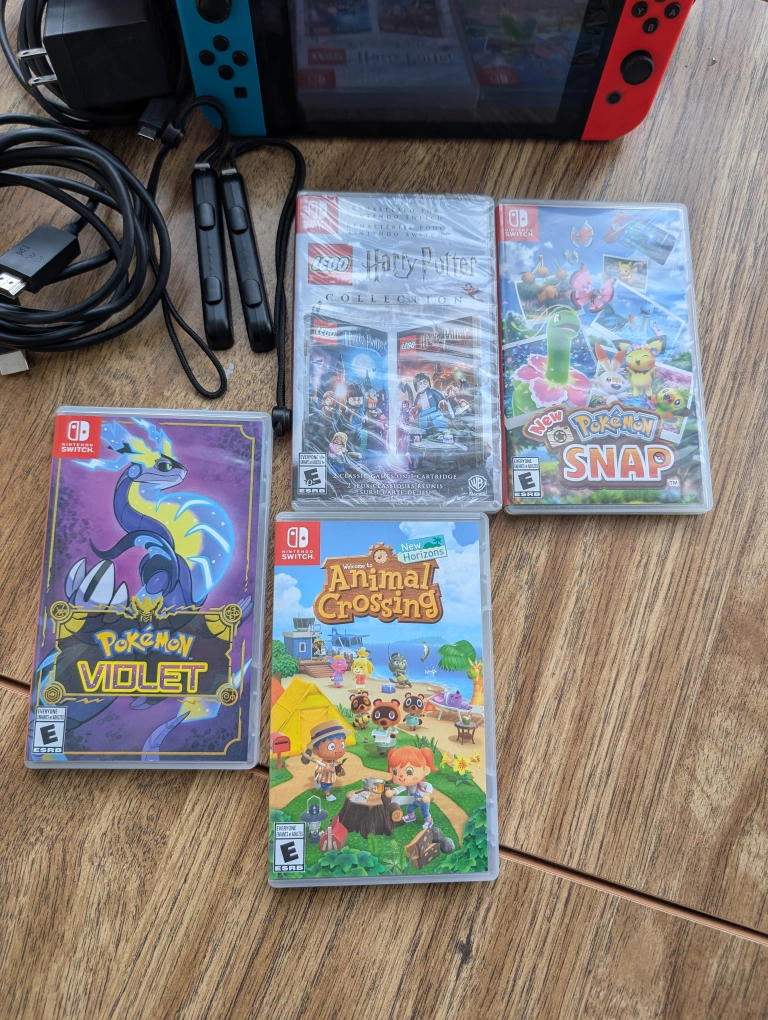 10Nintendo Switch console, blue and red Joy-Cons. Includes charger, HDMI cable, and wrist straps. Four games: Pokémon Violet, Animal Crossing: New Horizons, New Pokémon Snap, and Harry Potter Collection. Pre-owned, good condition.