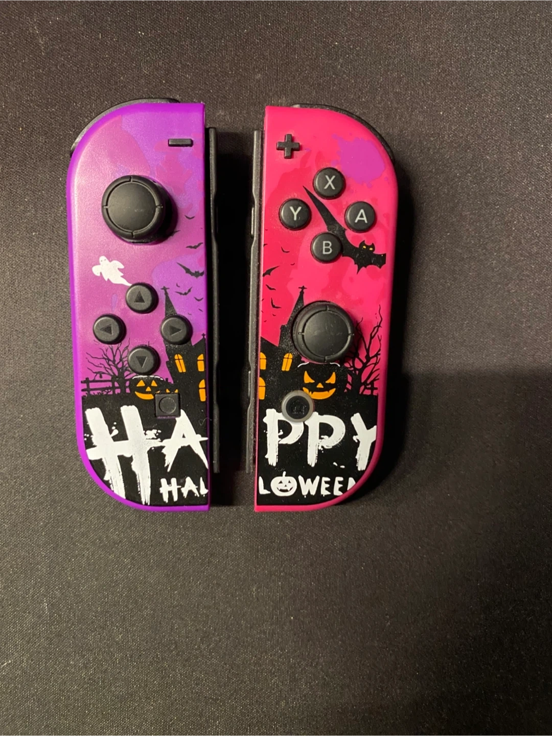 0Selling a pair of Nintendo Switch Joy-Cons with a fun Happy Halloween design! One is pink and the other is purple. Perfect for adding a spooky touch to your gaming setup!
