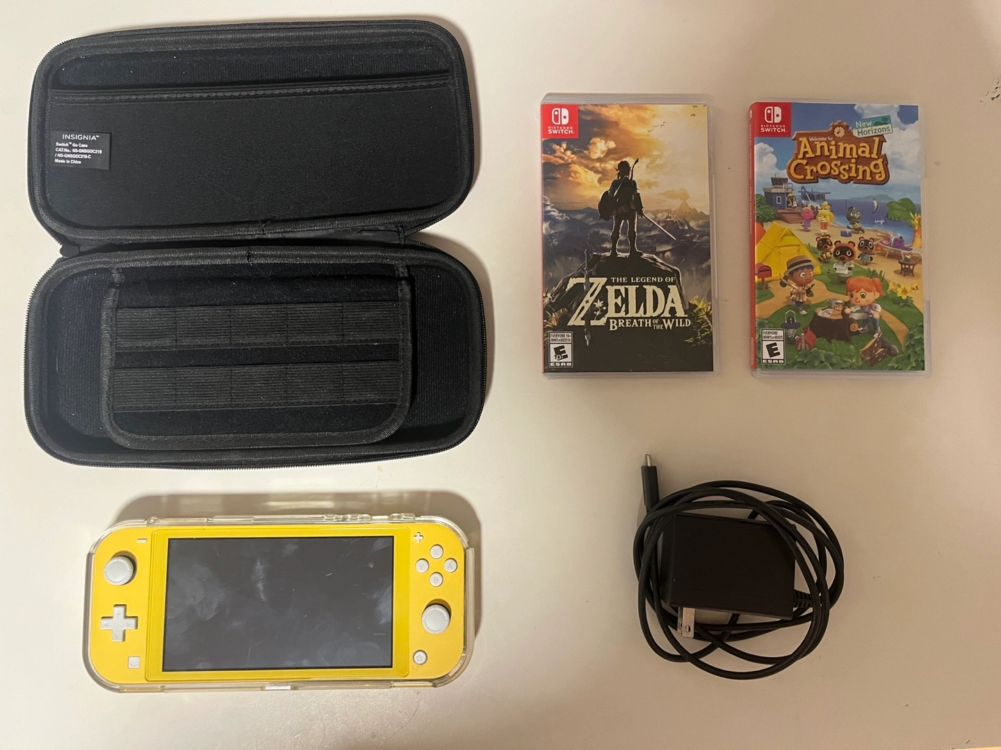 15Yellow Nintendo Switch Lite and charger. Has screen protection on comes with a clear case and a carrier. Includes games The Legend of Zelda: Breath of the Wild and Animal Crossing: New Horizons. Pick up at Coquitlam centre