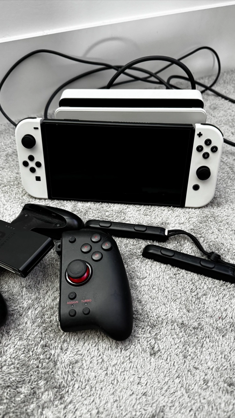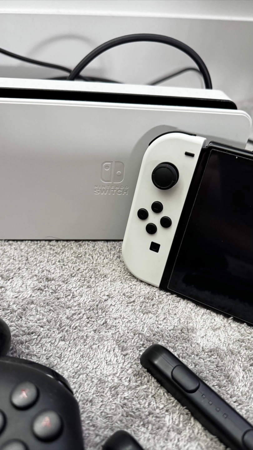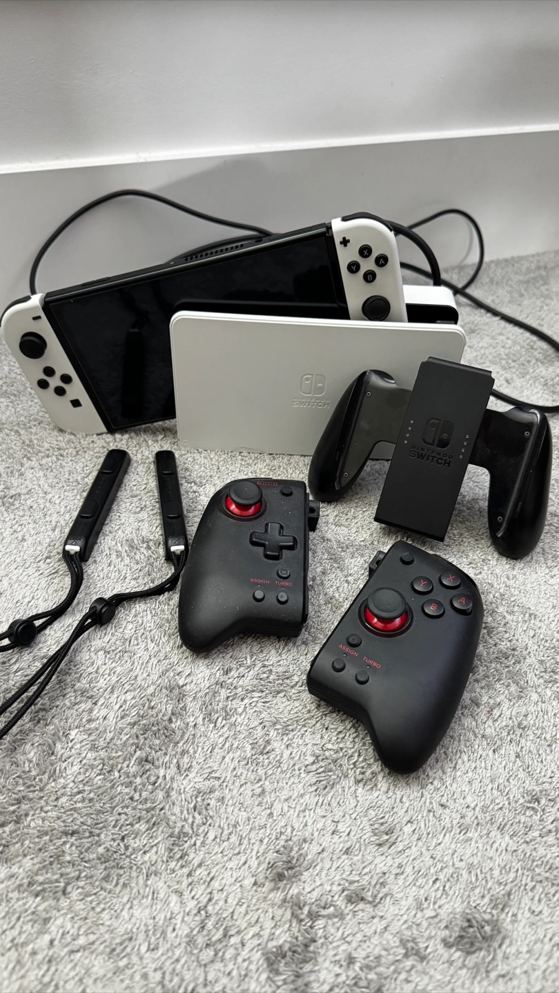 79White Nintendo Switch console. 512 GB microSD. Includes dock, Joy-Cons, Mario Odyssey case and two extra controllers. Has screen protection glass. Barely used! Joy-Cons have no drift. Have also large joy-cons for convenient gaming. Great for gaming on the go or at home.