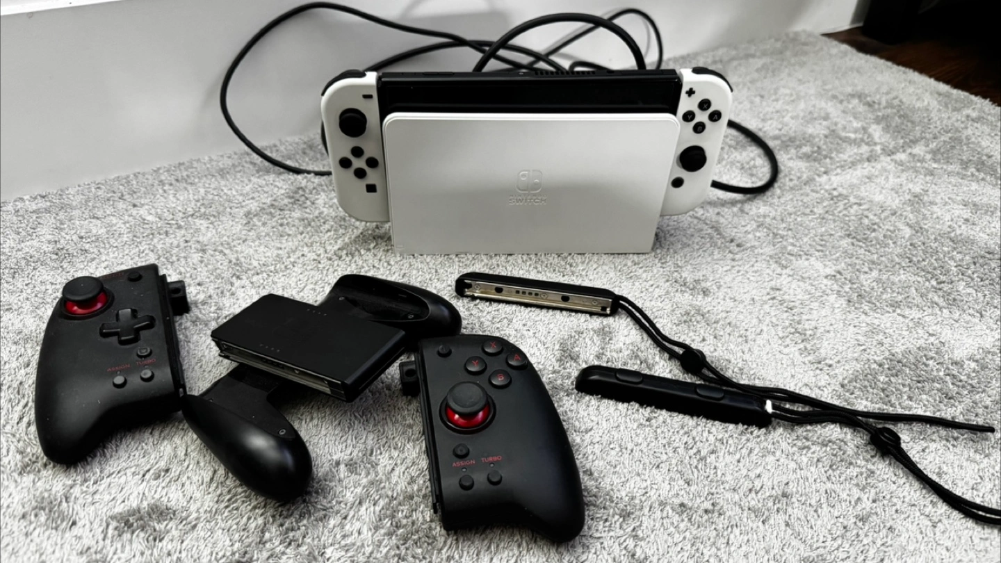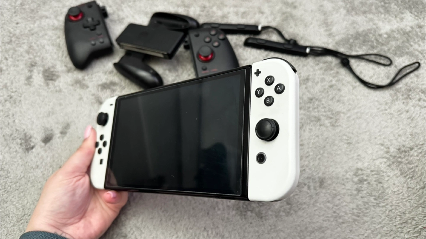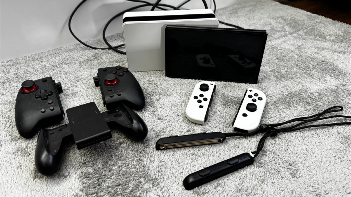 79White Nintendo Switch console. 512 GB microSD. Includes dock, Joy-Cons, Mario Odyssey case and two extra controllers. Has screen protection glass. Barely used! Joy-Cons have no drift. Have also large joy-cons for convenient gaming. Great for gaming on the go or at home.