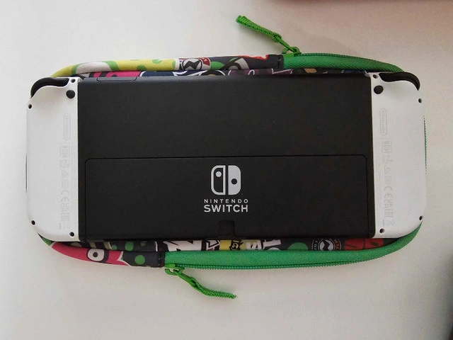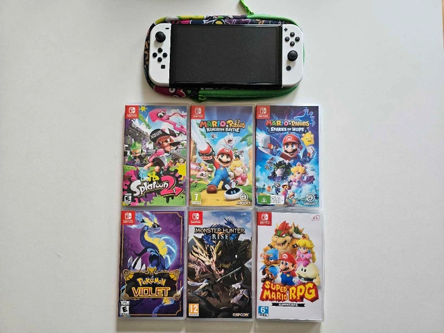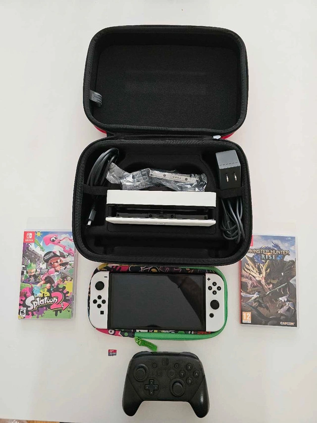 Selling barely used Nintendo Switch OLED bundle. It comes with a traveling case, 3 games, Splatoon soft case cover, Nintendo Pro Controller and 128 GB card. Also a protective glass is already installed on the console. Everything is in perfect condition. Please message for any queries. Games included Pokemon Violet, Mario RPG and Monster Hunter