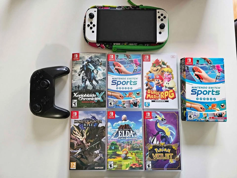 65Selling barely used Nintendo Switch OLED bundle. It comes with a traveling case, 2 games, Splatoon soft case cover, Nintendo Pro Controller and 128 GB card. Also a protective glass is already installed on the console. Everything is in perfect condition. Please message for any queries. FIRM PRICE. Games are all included. Selling as a bundle only.