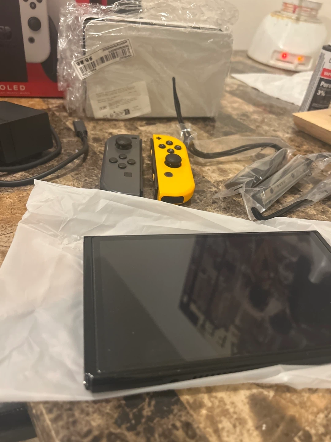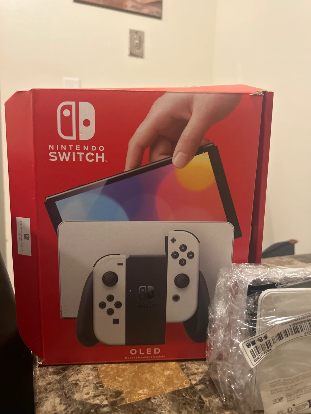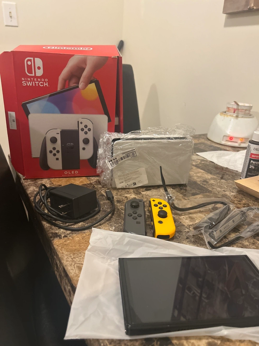 Selling a Nintendo Switch OLED model in white! It's in great condition and comes with all the original components and the box the Y controllers one of them got broke so these are replaced with new ones