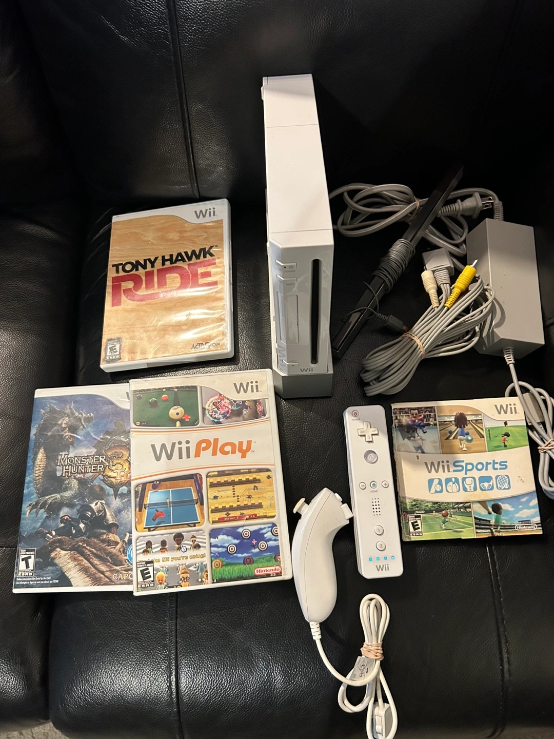 201Excellent condition. Everything tested and works great. Including Console, Console Stand, All Original Cords & Hookups, Wii Sensor Bar, Authentic Nintendo Wiimote (Brand New Batteries), Authentic Nintendo Nunchuck, Wii Sports, Wii Play Tony Hawk Ride & Monster Hunter 3. This system plays all Nintendo Wii & Nintendo GameCube Games. Selling altogether only. $100. Pick up in Steinbach or can meet up in Sage Creek or Deacons Corner