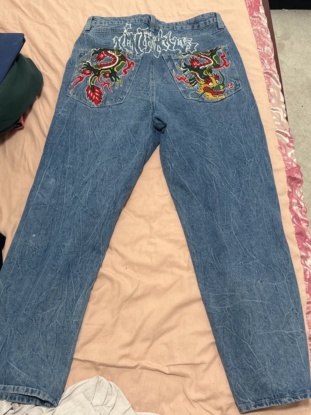 18Selling a pair of Ninth Ambush Hall jeans in size 32! These jeans feature unique dragon designs on the back pockets and a smaller design on the front. Great for adding a statement piece to your wardrobe!