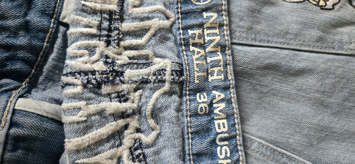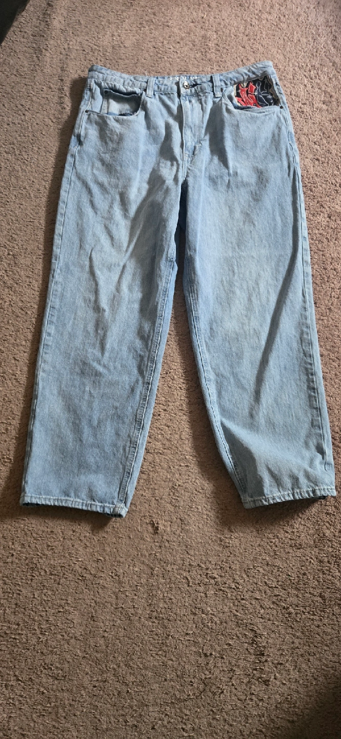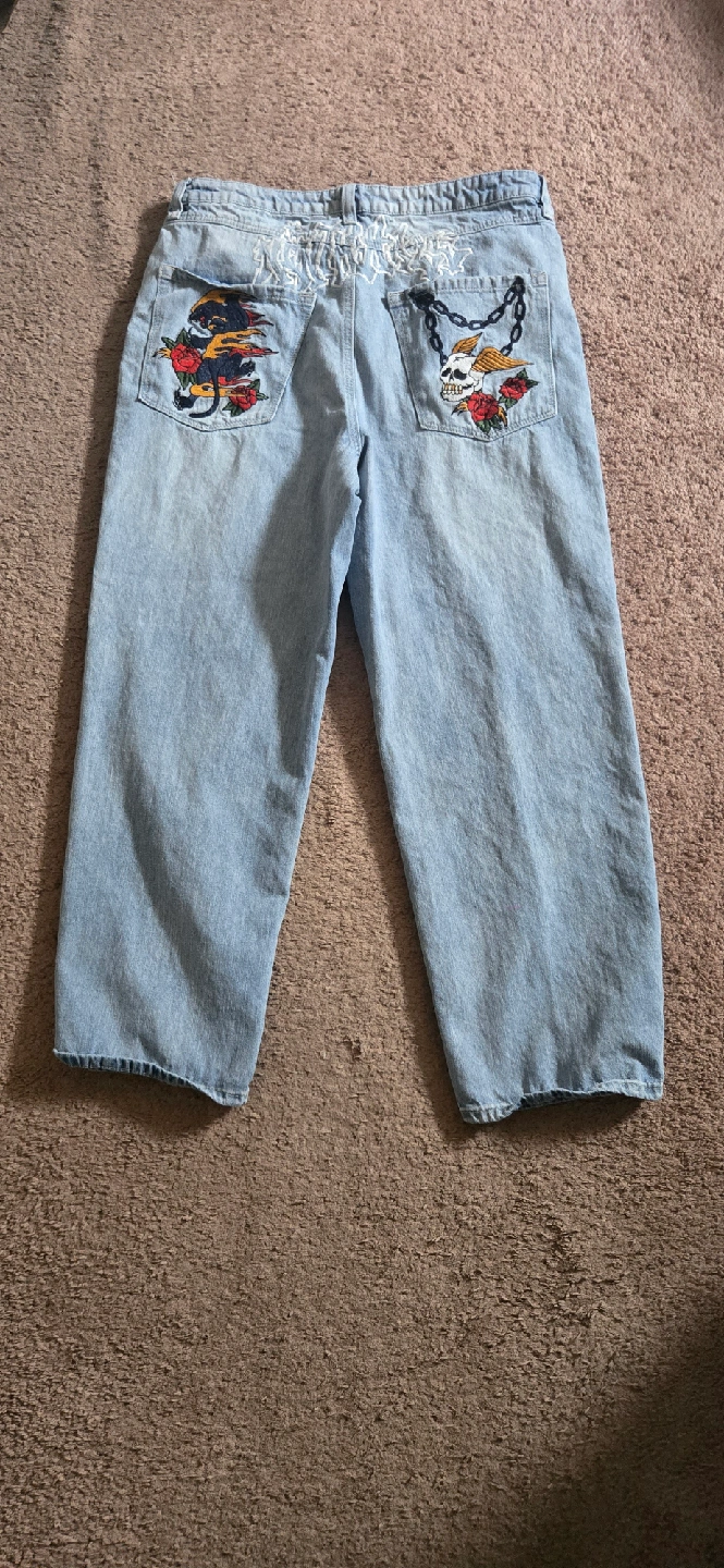 Selling a pair of ninth hall jeans in size 36. They feature unique designs on the back pockets and are in good condition. Perfect for adding a statement piece to your wardrobe!