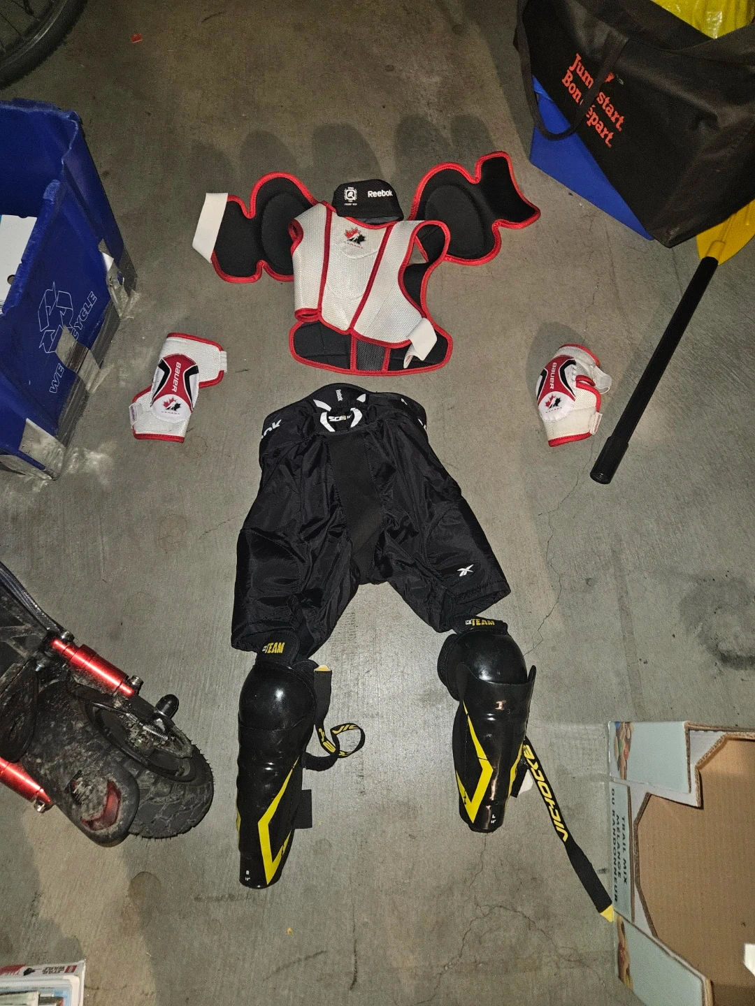 This hockey gear set includes Reebok pants, shoulder pads, and elbow pads, along with CCM shin guards. Several pieces are black with red, white, and yellow accents. Sizes appear to be youth or junior.
