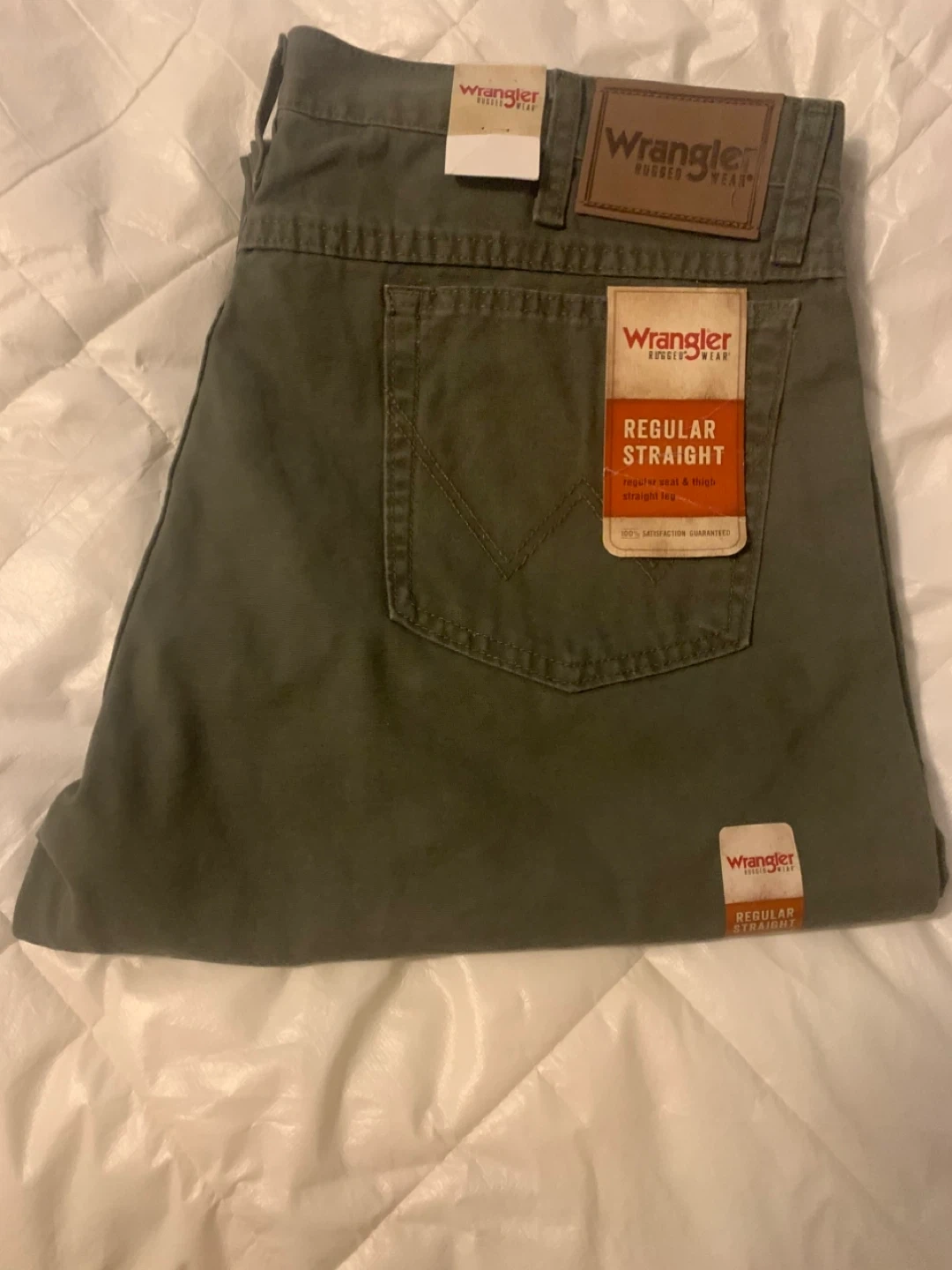 Wrangler Rugged Wear pants in a regular straight fit. These are a size medium and are olive green in color.