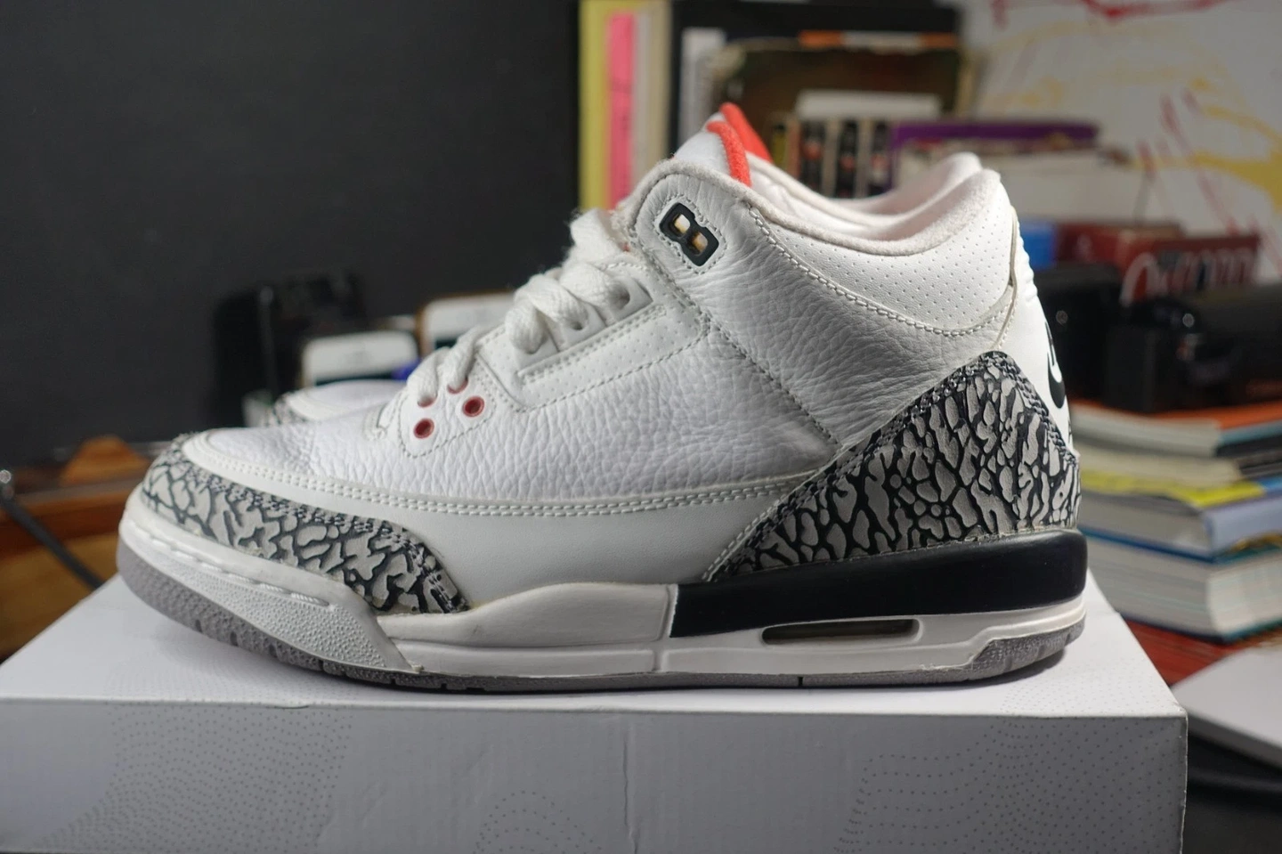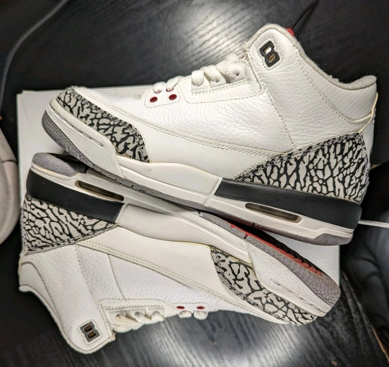 Nike Air Jordan 3 Retro '88' White Cement sneakers. Low top, lace-up closure. Features elephant print pattern and cushioned sole. Upper material is leather, outsole is rubber. Perfect for basketball, activewear, or casual wear. Release year 2013. US Shoe Size: 6, EU Shoe Size: 38.5, UK Shoe Size: 5.5. Colors: White, Black, Red, Grey. Style: Sneaker. Theme: Retro.
