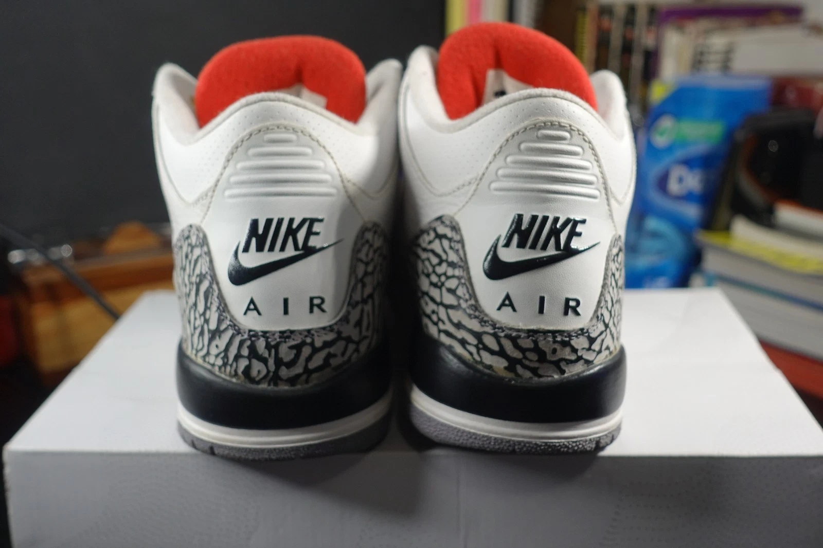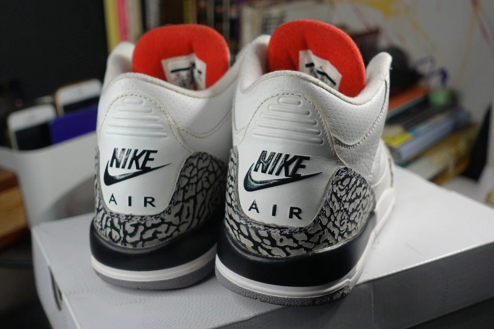 Nike Air Jordan 3 Retro '88' White Cement sneakers. Low top, lace-up closure. Features elephant print pattern and cushioned sole. Upper material is leather, outsole is rubber. Perfect for basketball, activewear, or casual wear. Release year 2013. US Shoe Size: 6, EU Shoe Size: 38.5, UK Shoe Size: 5.5. Colors: White, Black, Red, Grey. Style: Sneaker. Theme: Retro.