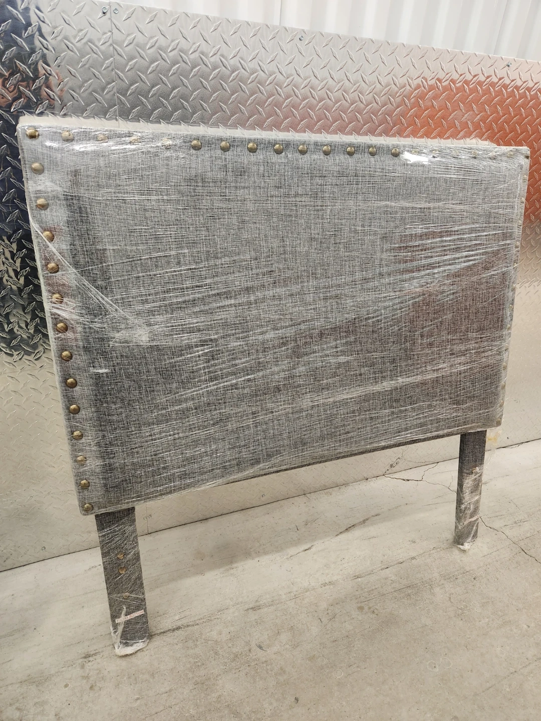 This is a grey upholstered twin headboard with decorative stud detailing along the edges. It's designed to attach to a bed frame. The headboard is covered in plastic wrap for protection.this headboard is brand new. Can easily being attached to the metal bed frame. Metal bed frame is available too but is separated from this listed item!