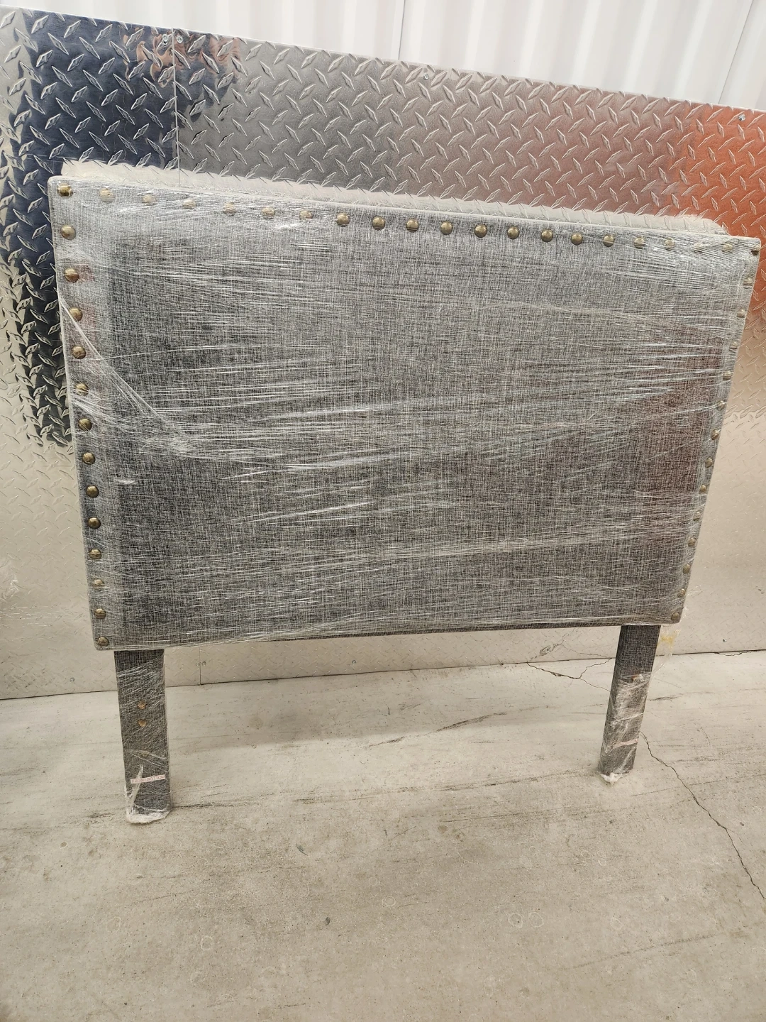 This is a grey upholstered twin headboard with decorative stud detailing along the edges. It's designed to attach to a bed frame. The headboard is covered in plastic wrap for protection.this headboard is brand new. Can easily being attached to the metal bed frame. Metal bed frame is available too but is separated from this listed item!