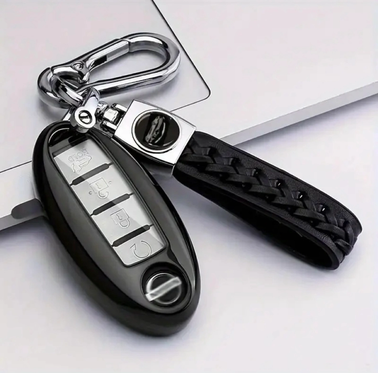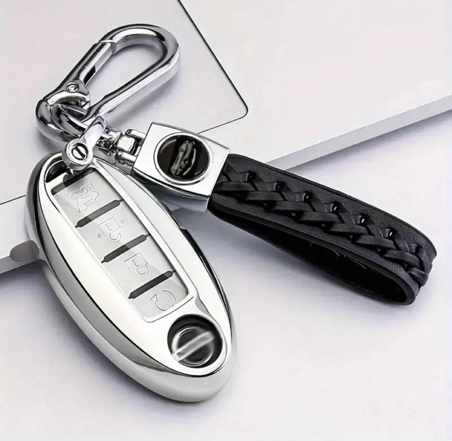 47Protective key fob cover for Nissan vehicles. Features a braided leather strap and carabiner clip. Available in red, silver, and black.