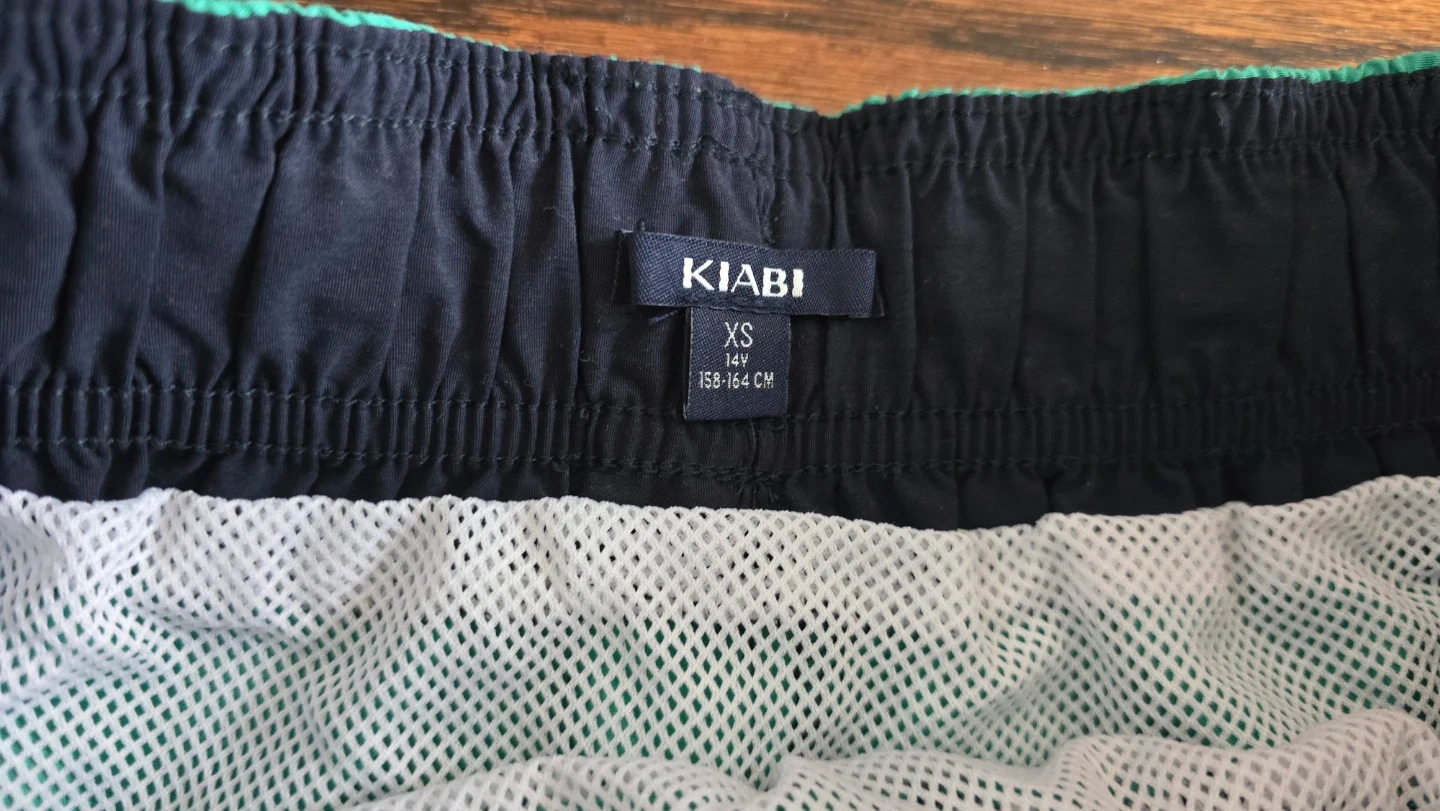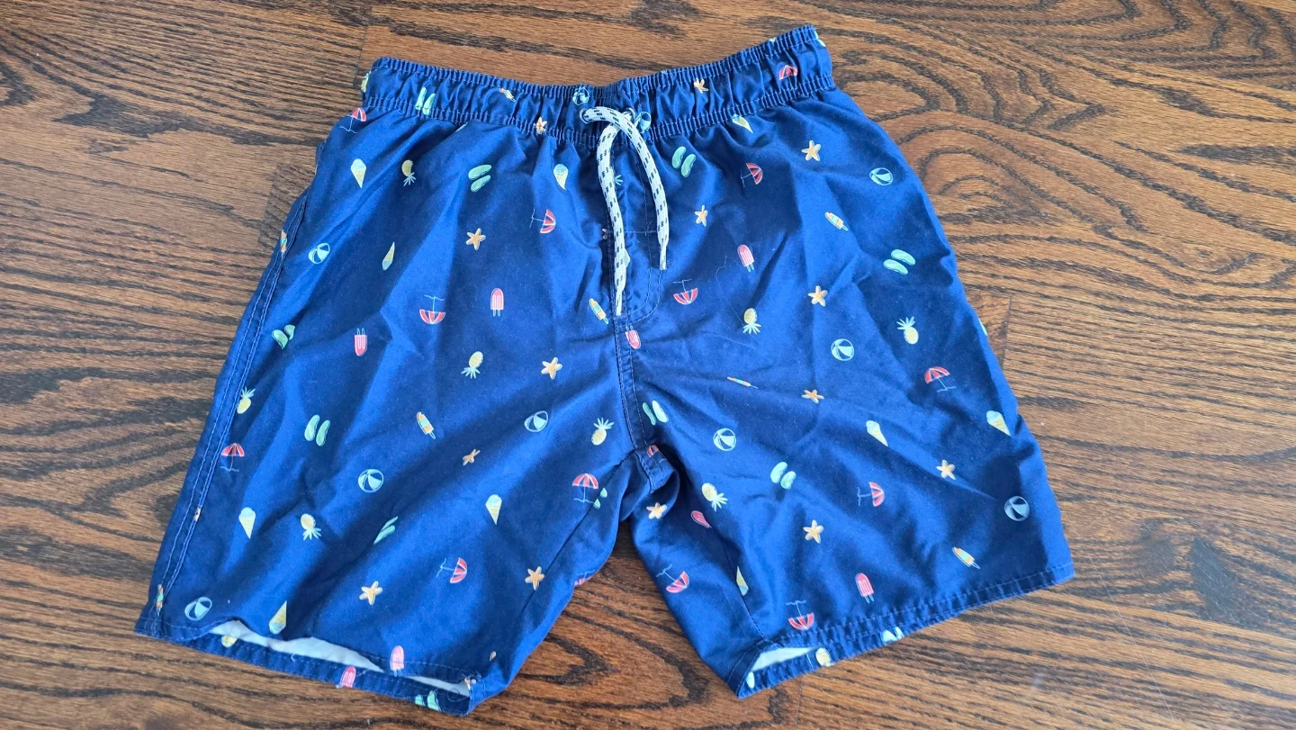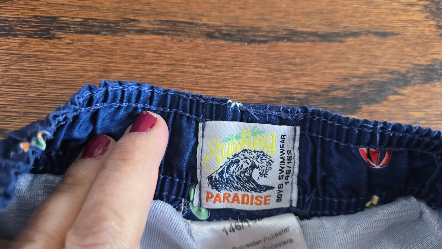 Two pairs of boys swim trunks. One pair features a navy blue colour with green palm tree print and a turquoise waistband. The second pair is navy blue with a colourful print of beach items like umbrellas and popsicles. Both have elastic waistbands with drawstring ties. Size XS, fits 146-152 cm.
