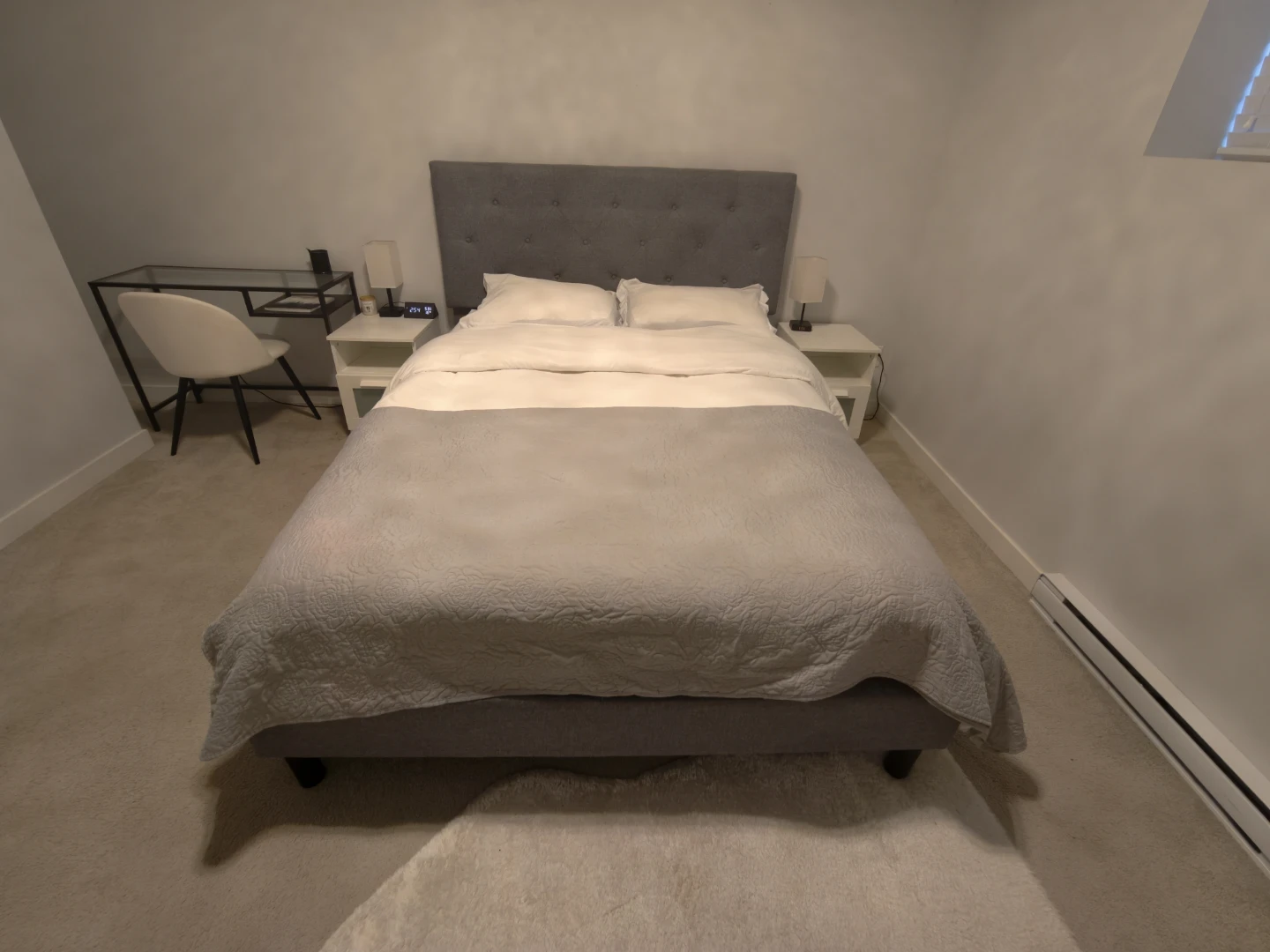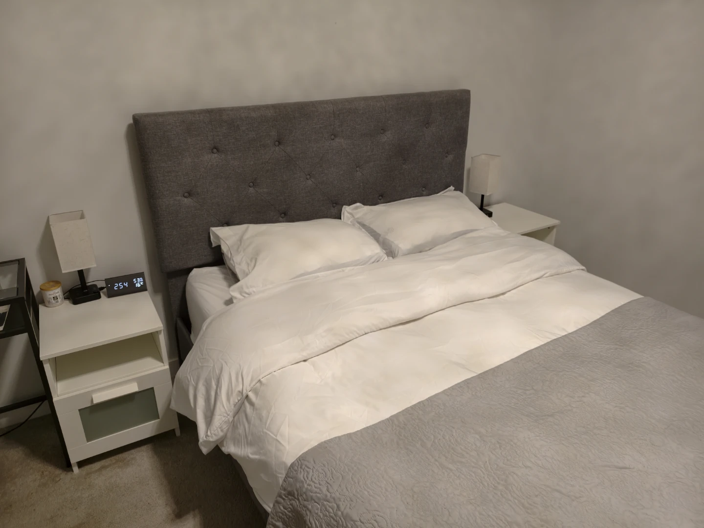 Queen size bed frame with a stylish grey upholstered headboard. The headboard features a diamond tufted design. Includes bed frame and headboard mattress night stand