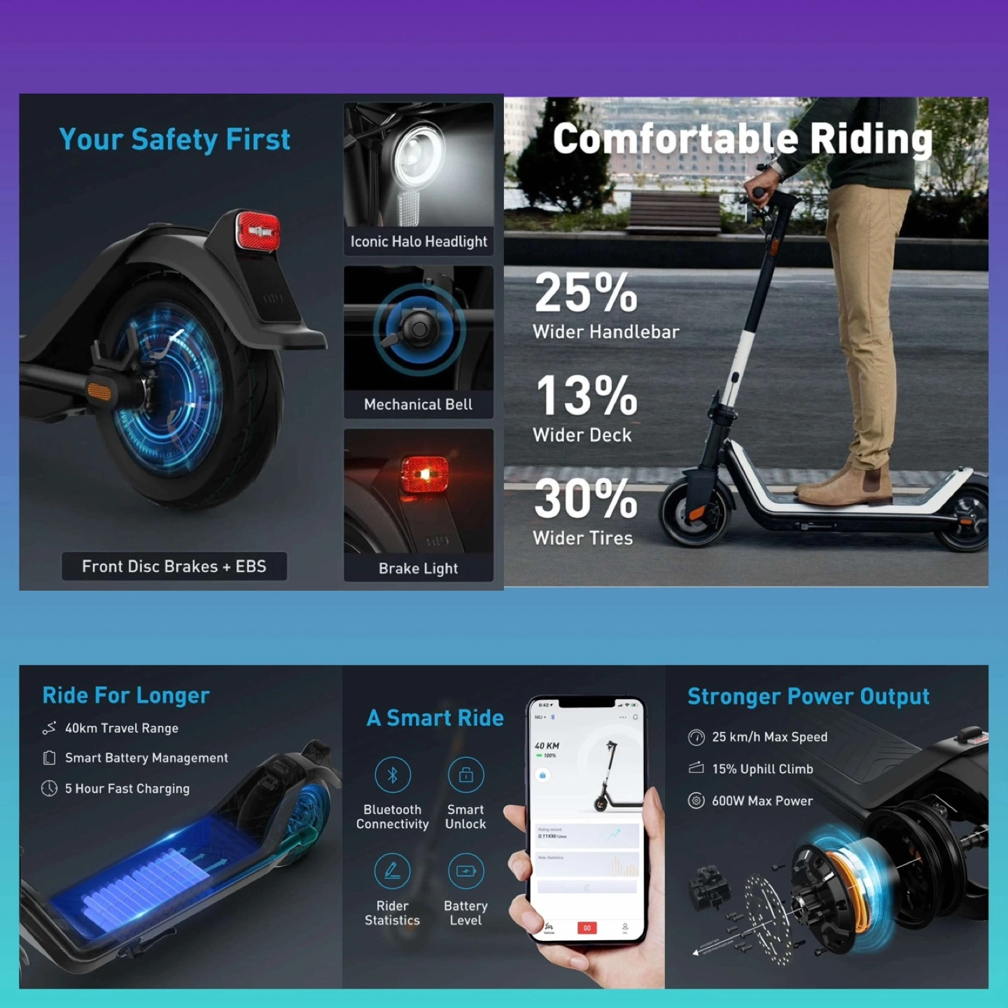 Excellent condition. Powerful motor. Long battery life. Features include front disc brakes, electronic braking system, bright headlight, and comfortable wide deck. Bluetooth connectivity.
