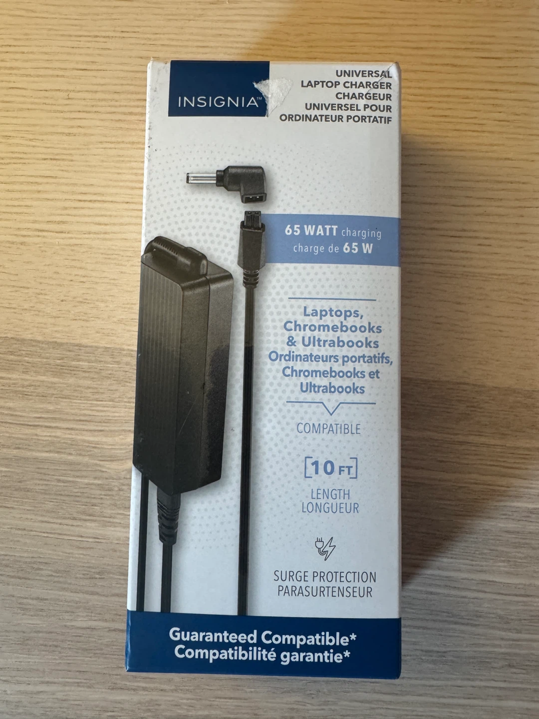 This is a 65 Watt universal laptop charger compatible with laptops, Chromebooks, and Ultrabooks. It provides up to 65W of power and has surge protection. The cable length is 10 ft.