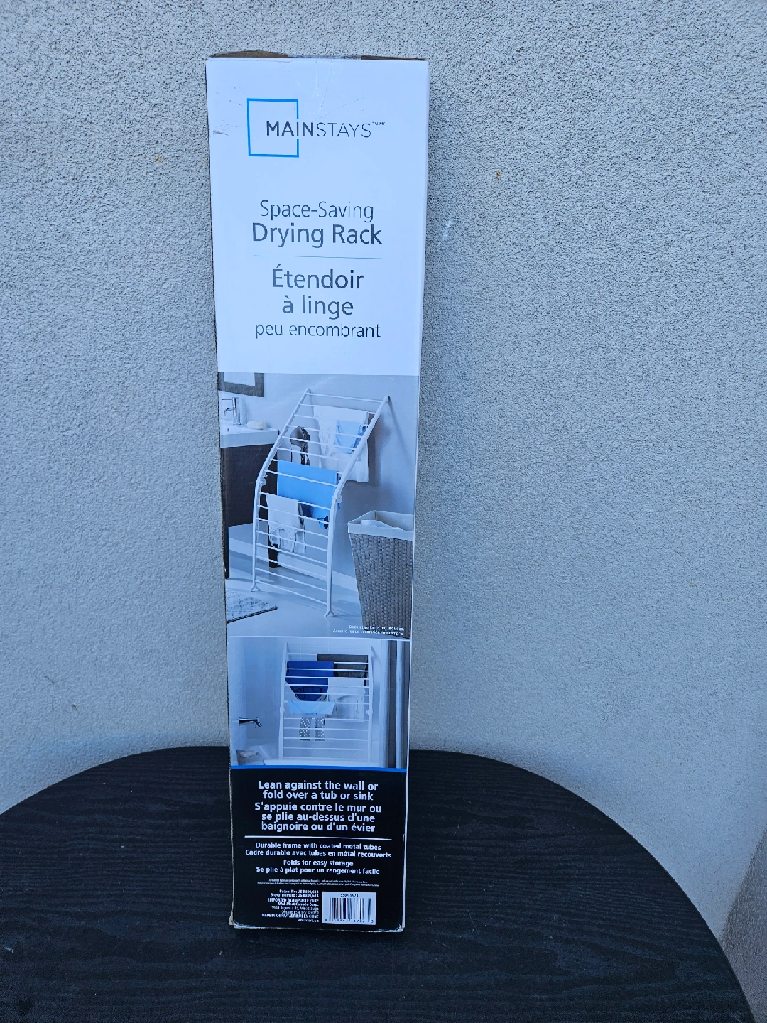 Selling a brand new Mainstays space-saving drying rack, still in its original box! This is perfect for small spaces, as it can lean against the wall or be folded over a tub or sink. The durable frame is coated with metal tubes for easy cleaning. When not in use, it folds flat for convenient storage. Dimensions are 26.8 inches wide x 3 inches deep x 51.5 inches high (68 cm x 7.6 cm x 130.8 cm)