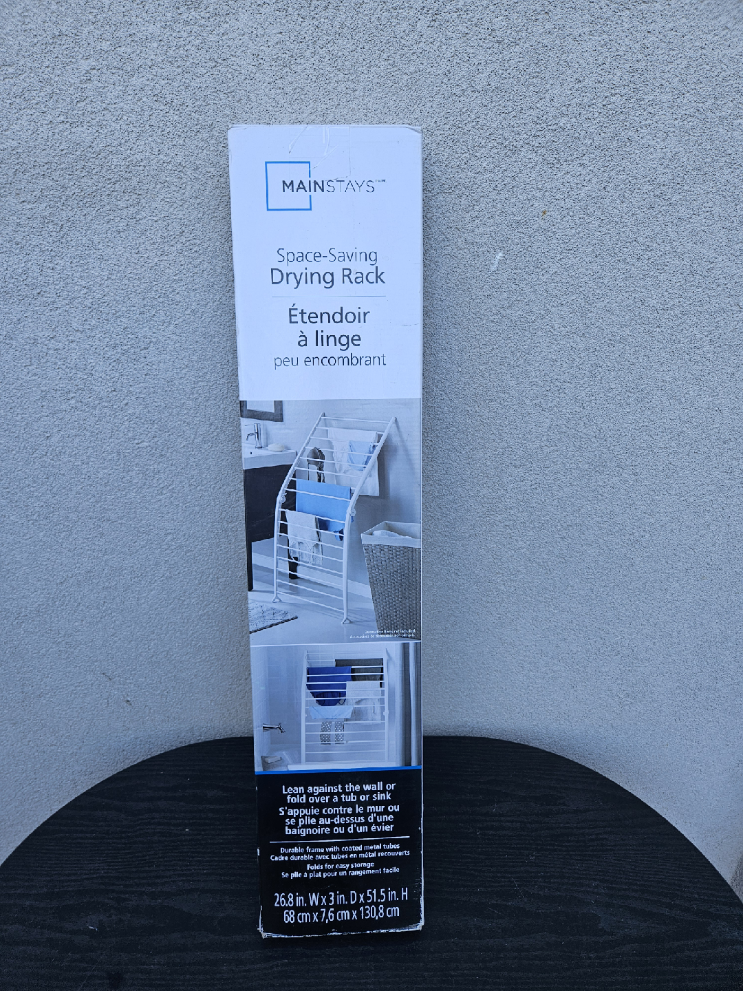 Selling a brand new Mainstays space-saving drying rack, still in its original box! This is perfect for small spaces, as it can lean against the wall or be folded over a tub or sink. The durable frame is coated with metal tubes for easy cleaning. When not in use, it folds flat for convenient storage. Dimensions are 26.8 inches wide x 3 inches deep x 51.5 inches high (68 cm x 7.6 cm x 130.8 cm)
