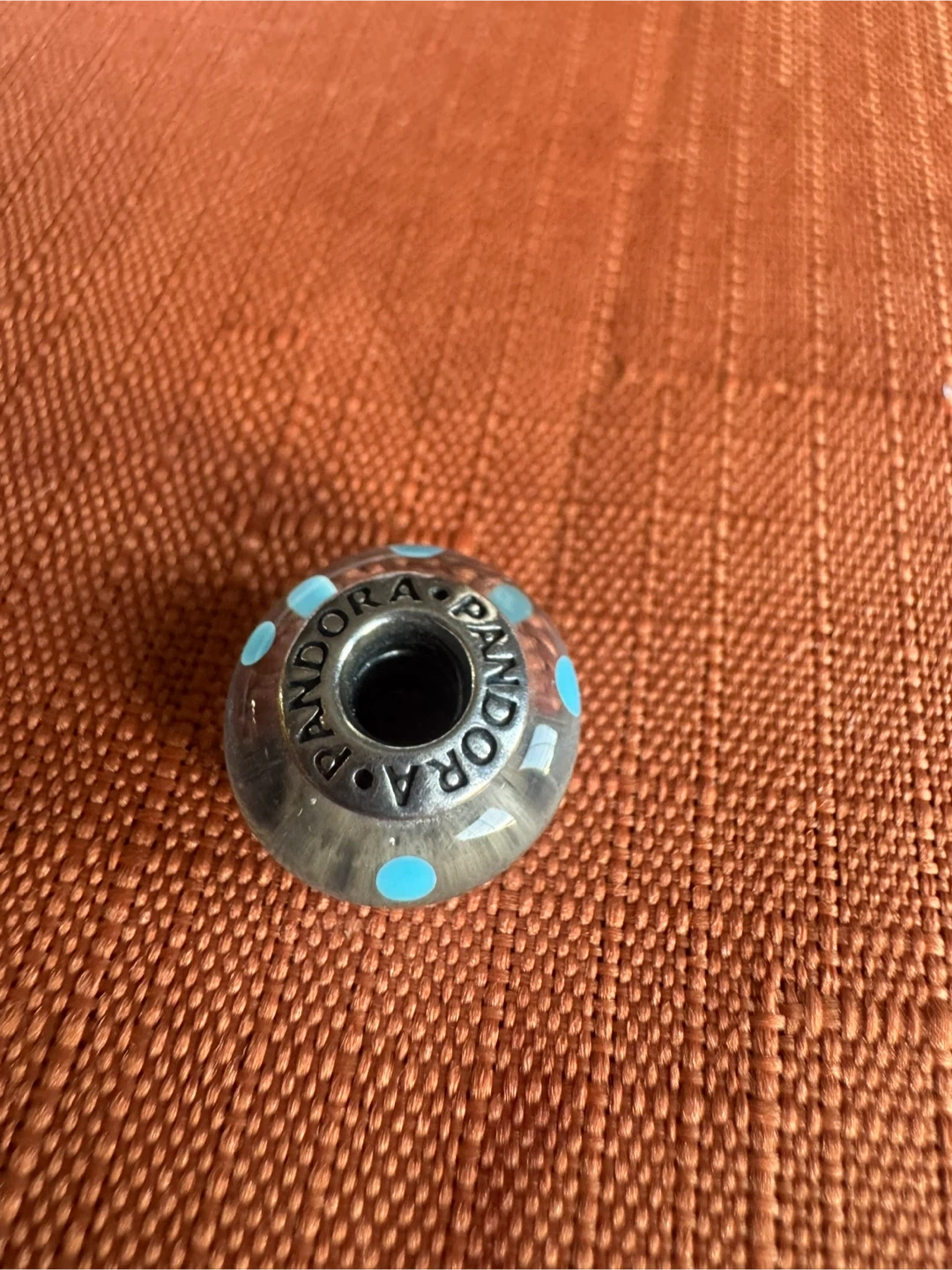 This is an Authentic Pandora glass charm. It's clear with blue polka dots. It's a nice addition to a bracelet!