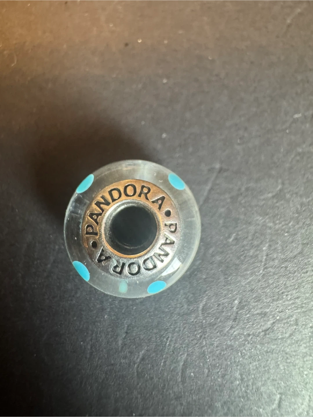 This is an Authentic Pandora glass charm. It's clear with blue polka dots. It's a nice addition to a bracelet!