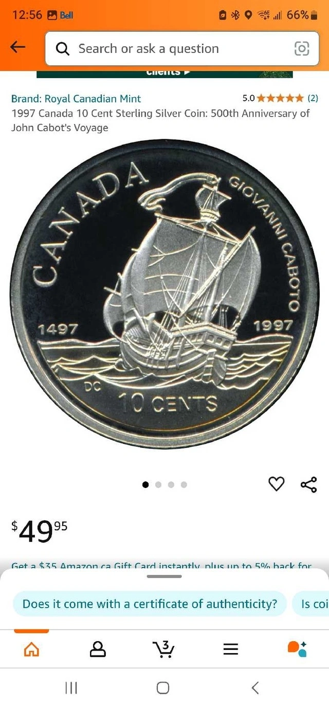 John Cabot sterling silver dime in collectible folder. Includes two collectible stamps. TEXT or call the number on this ad page if interested.