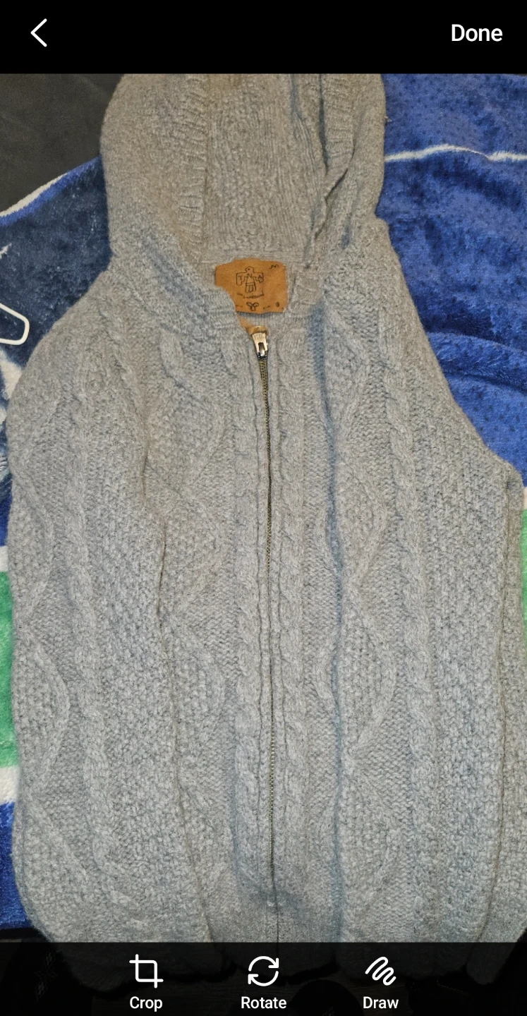 Cozy grey lambswool zip-up hoodie with a cable knit pattern. It's a size medium and features a front zipper. Perfect for staying warm on chilly days!