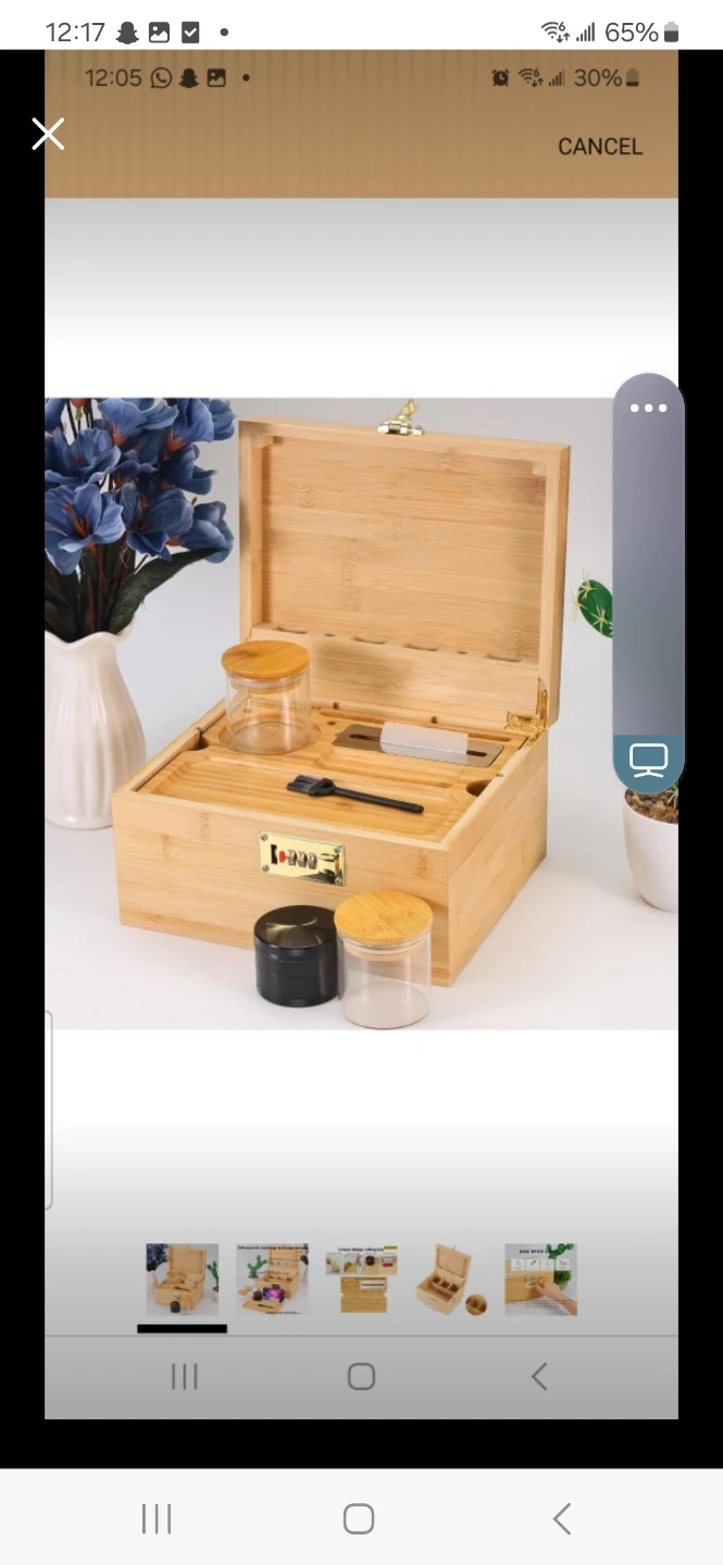 Bamboo storage box with a built-in combination lock. It includes compartments, a glass jar, a grinder, and a small brush. The lid has a hinge for easy access. This box is great for organizing small items.