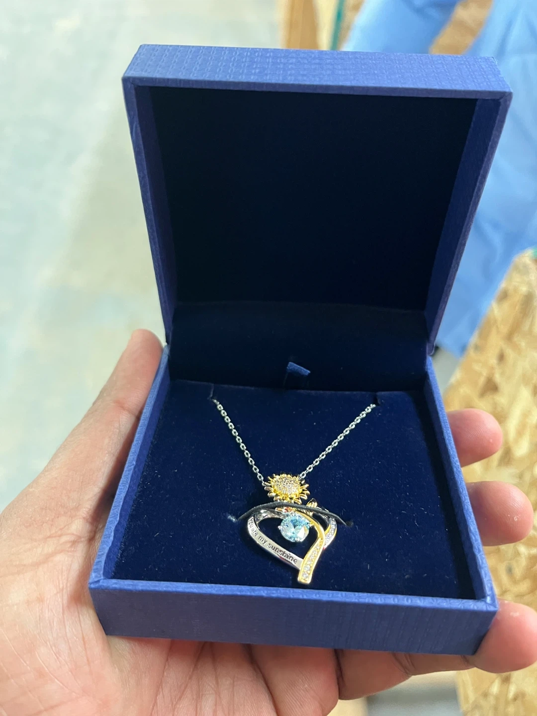 A beautiful necklace featuring a heart-shaped pendant with a sunflower accent and an aquamarine gemstone. The pendant has "You are my sunshine" engraved on it. Comes in a blue gift box. It's a lovely piece for anyone!