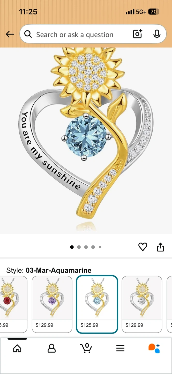 A beautiful necklace featuring a heart-shaped pendant with a sunflower accent and an aquamarine gemstone. The pendant has "You are my sunshine" engraved on it. Comes in a blue gift box. It's a lovely piece for anyone!