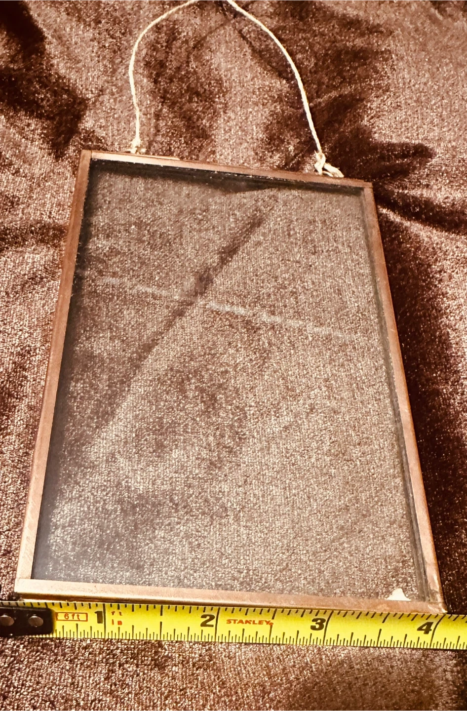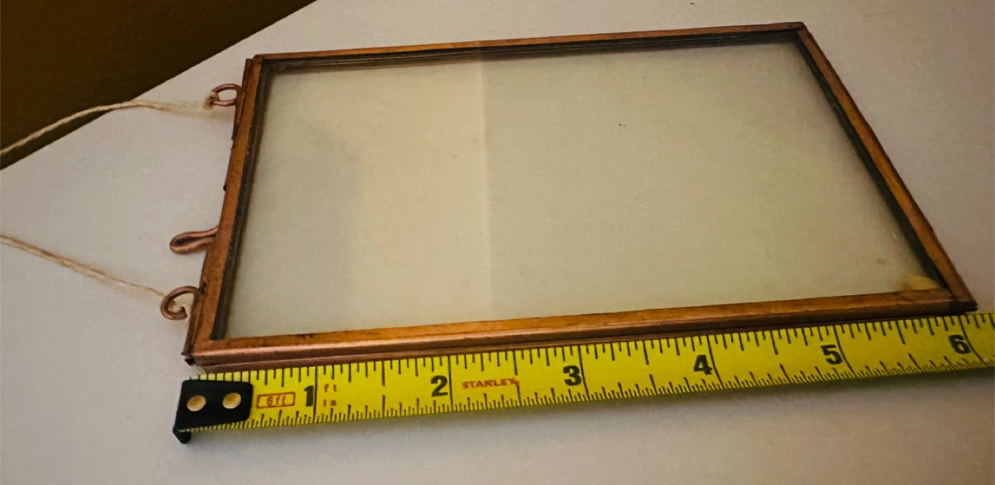 This is a decorative hanging photo frame. It's made with a copper-toned metal frame and clear glass panels. The frame has a rope for hanging. It's suitable for displaying photos or small mementos.