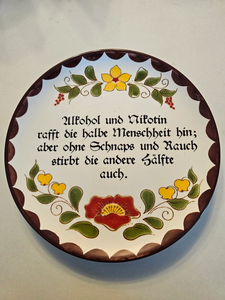 Selling a Schramberg Handbemalt decorative plate. It features a unique design and would be a lovely addition to any home! The plate has a floral pattern and German text. Numbered limited edition.