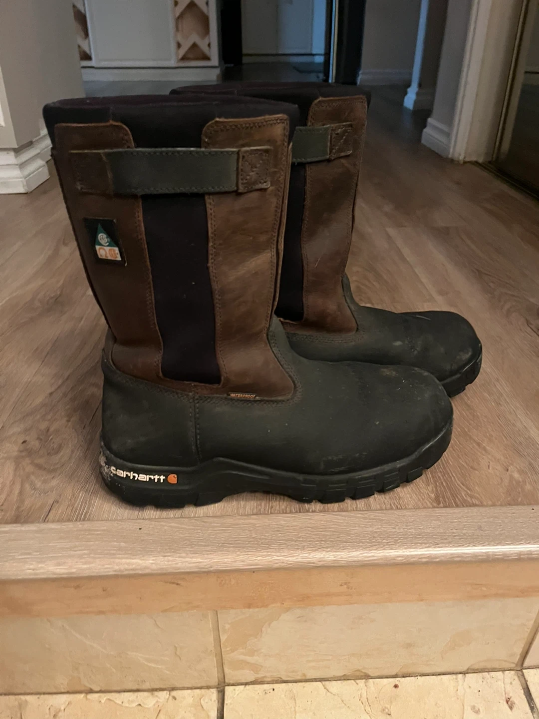 Durable Carhartt work boots designed for tough conditions. These waterproof boots feature a comfortable pull-on design and sturdy construction for all-day wear. They're built to protect your feet on the job.