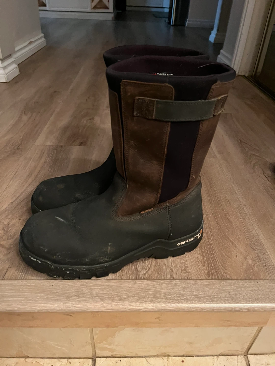 Durable Carhartt work boots designed for tough conditions. These waterproof boots feature a comfortable pull-on design and sturdy construction for all-day wear. They're built to protect your feet on the job.
