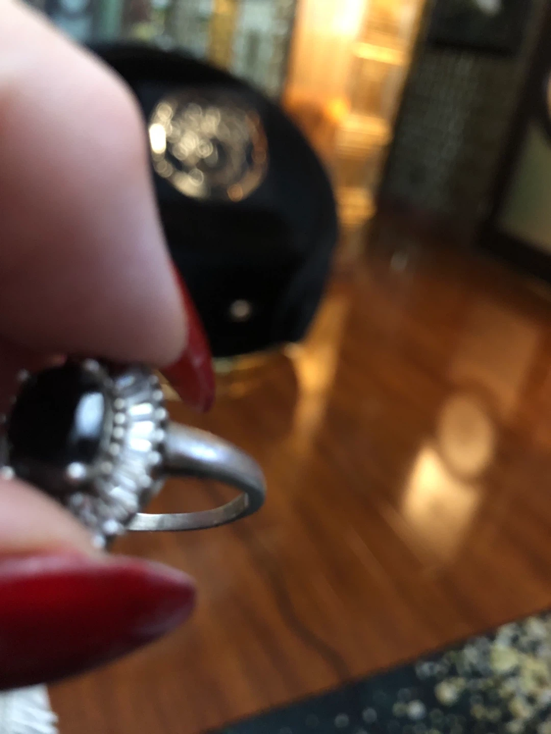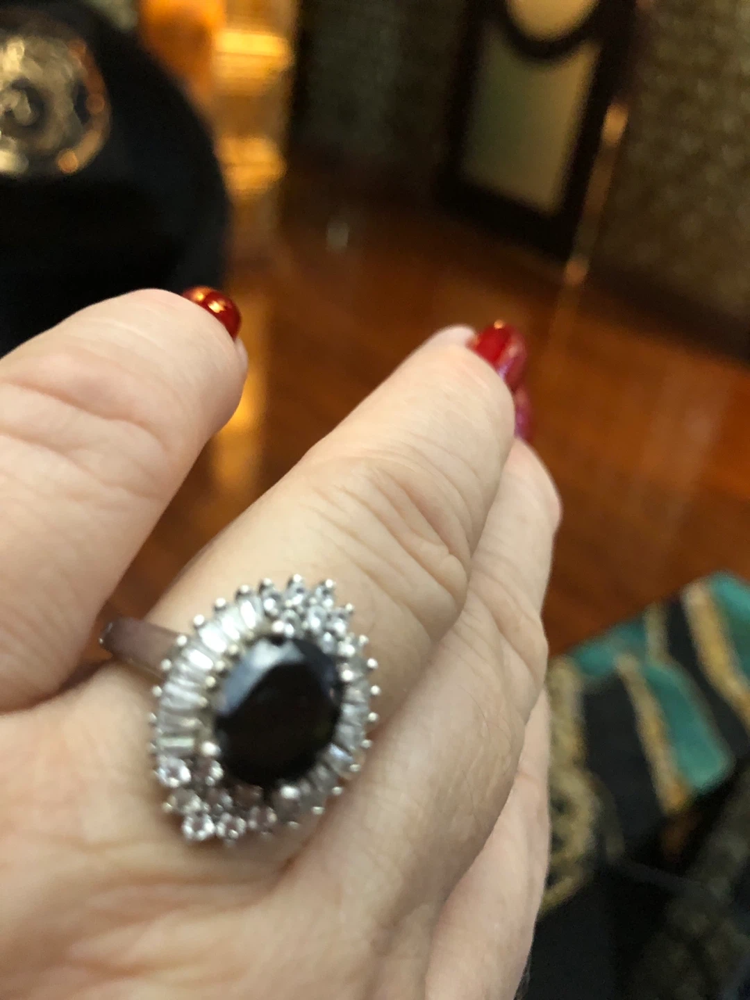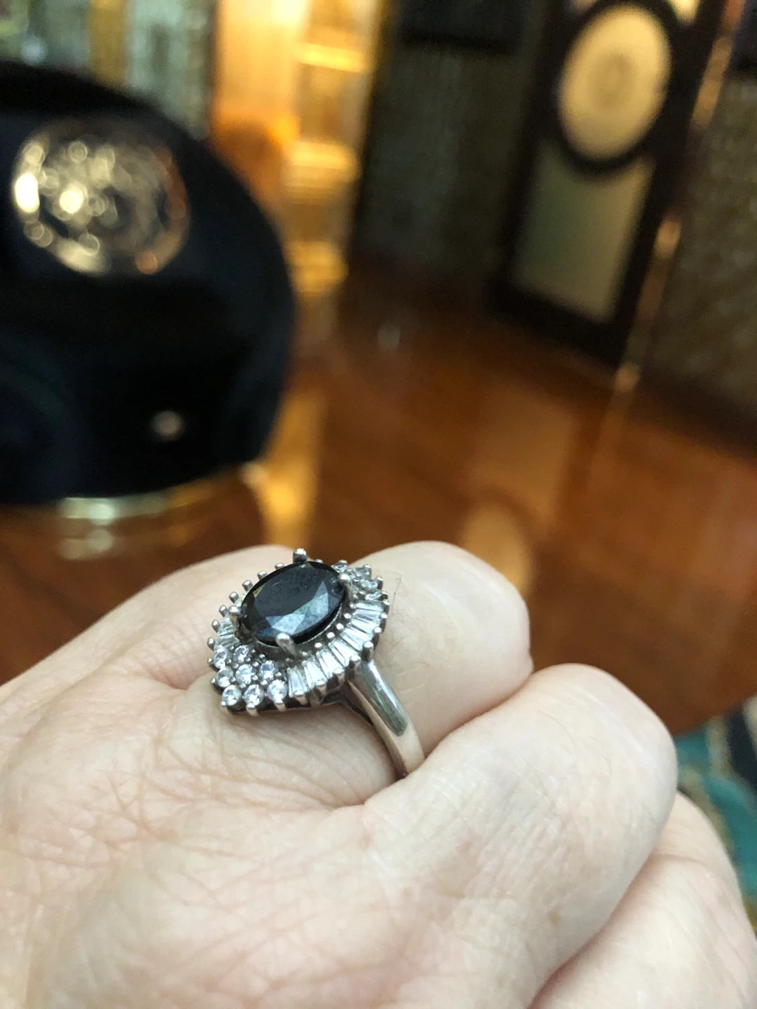 A beautiful ring featuring a central oval black stone surrounded by smaller clear stones. The band is made of silver-toned metal. It's a lovely piece for any occasion!