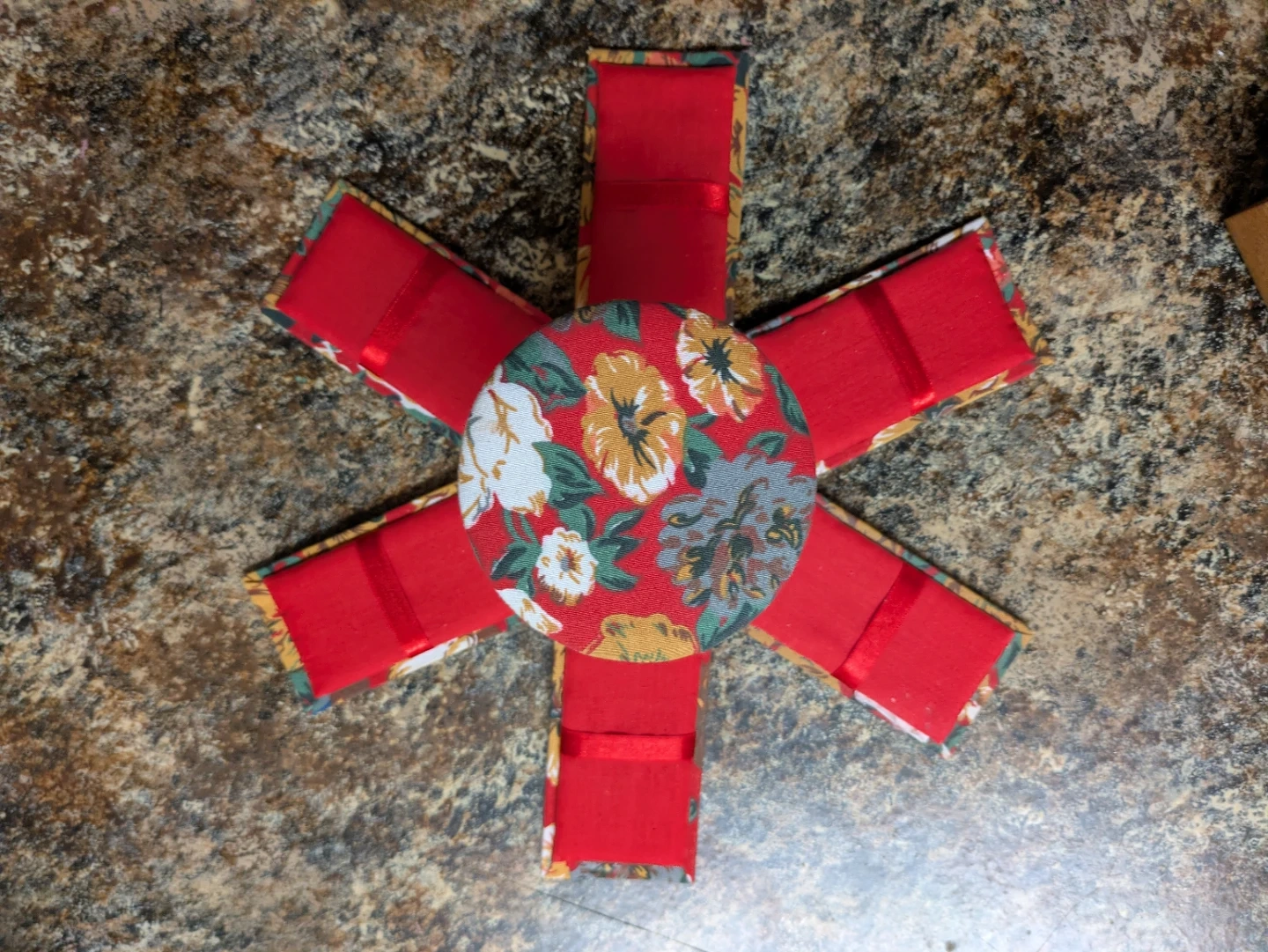 This vintage Avon fabric-covered box features a vibrant floral pattern with red, yellow, and green accents. It's hinged and opens to reveal multiple compartments inside. It's perfect for storing small keepsakes, craft supplies or anything you want.